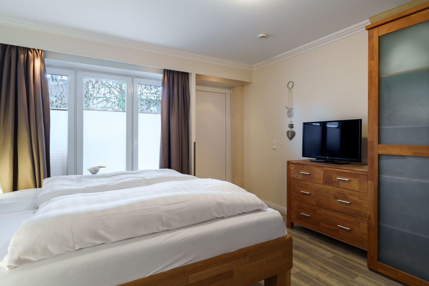 Doppelbett mit getrennten Matratzen (Komfort-Einstiegshöhe 65cm), Kleiderschrank 3-türig, Kommode, Flachbild TV, Nachtschränke, Korbsessel, Zugang zur Ost-Terrasse, Plissee und Verdunkelungsvorhang, Zugang zur Ostterrasse