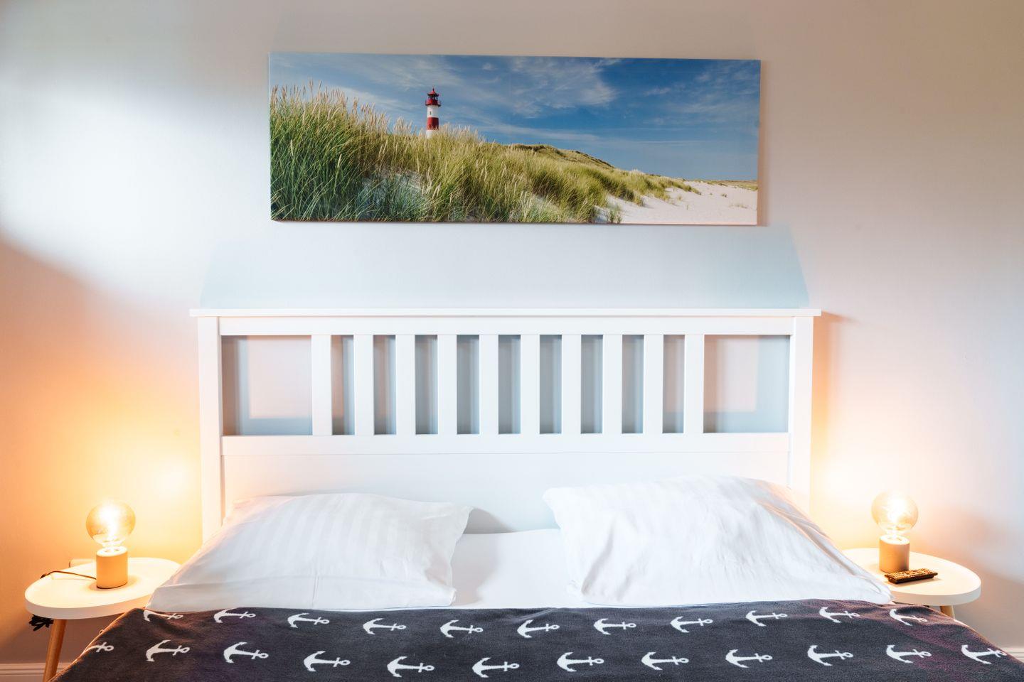 Doppelbett (getrennten Matratzen) mit 2 Nachtkonsolen, Lattenrost Kopf- und Fußteil höhenverstellbar, Flachbild-TV, 3türiger Kleiderschrank, Kommode, Zugang zur Ostterrasse, Plissees und Verdunkelungsvorhang, Korbsessel