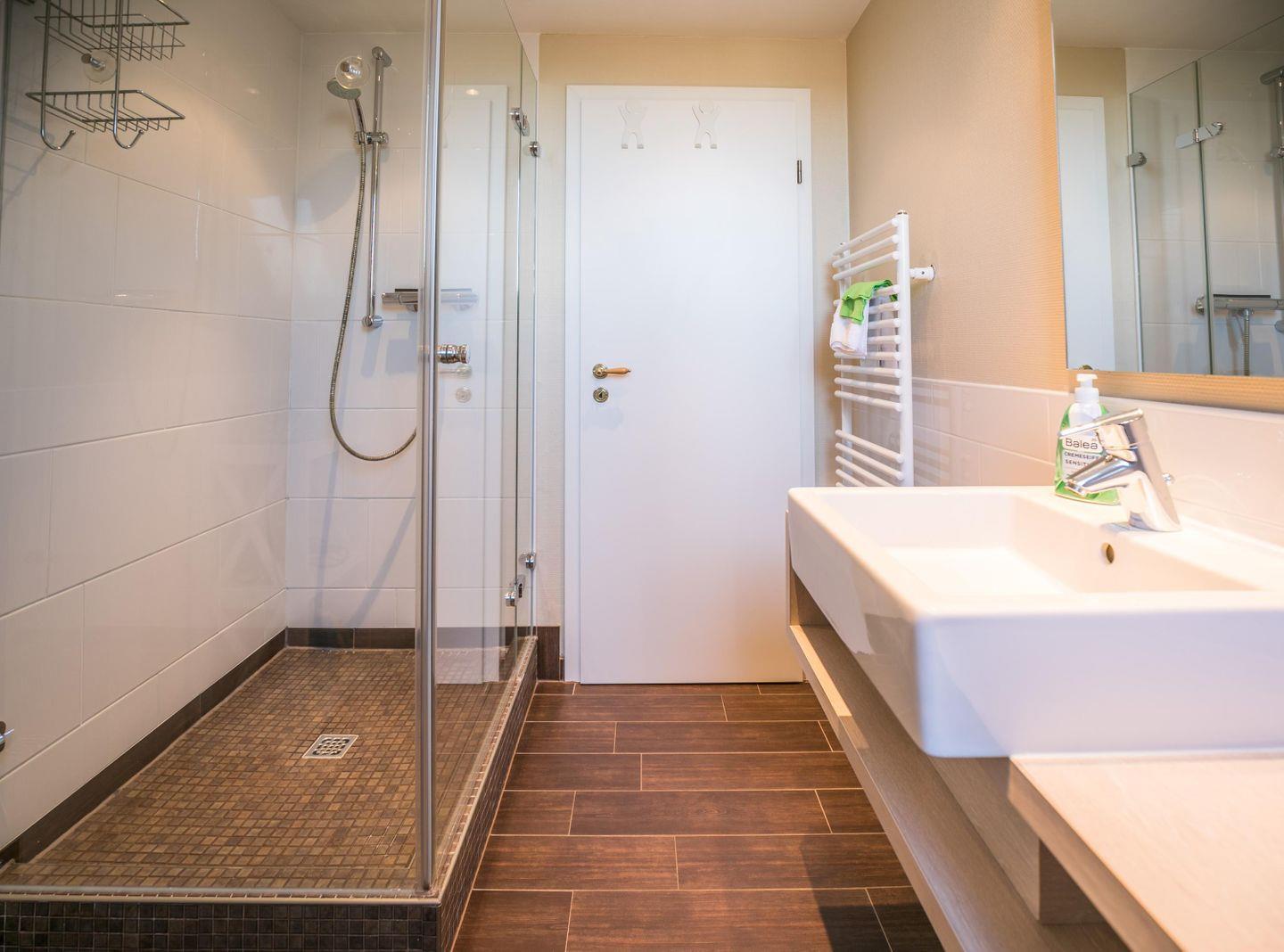 Duschbad mit Fenster, Waschtisch, WC, Handtuchtrockner, Fenster