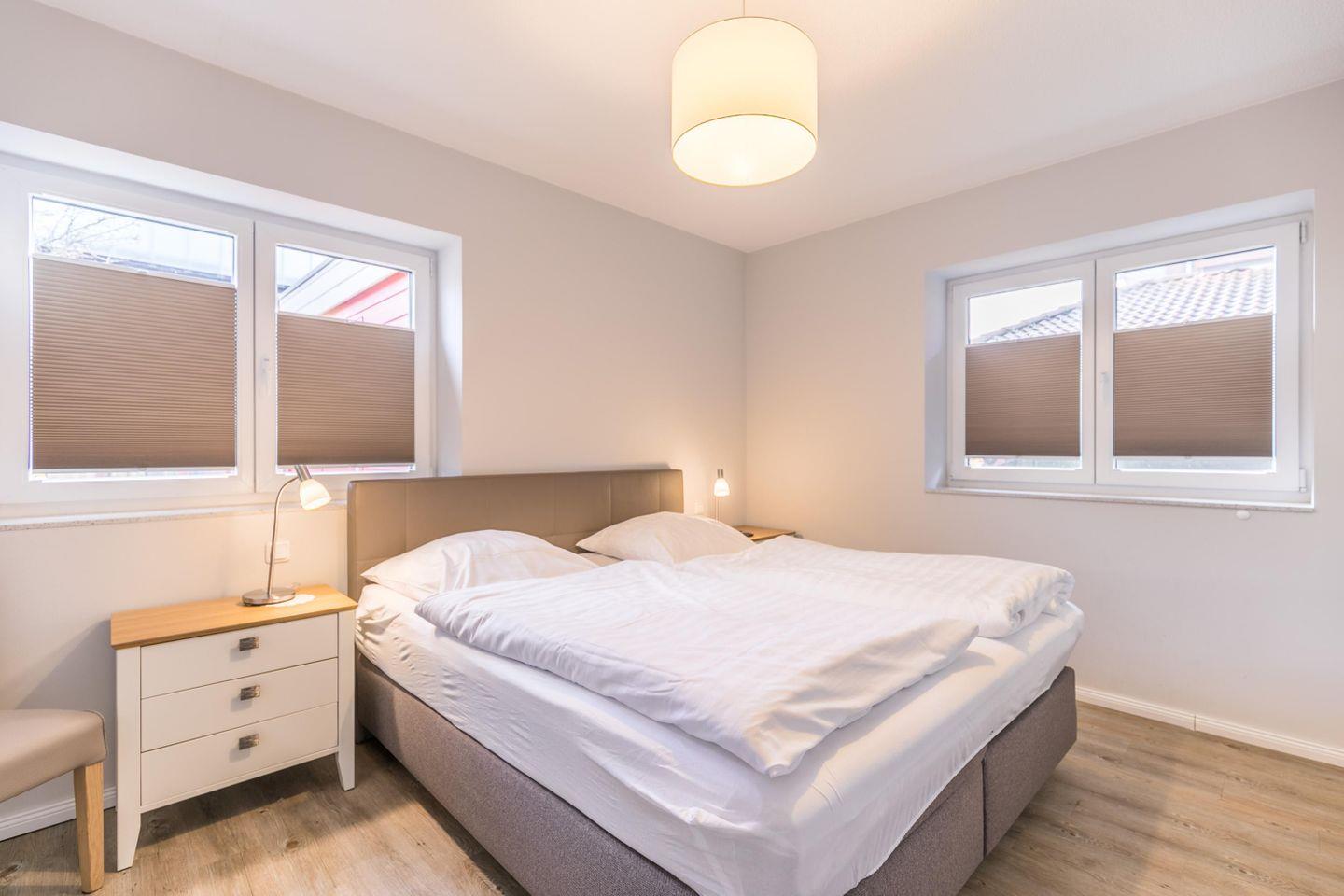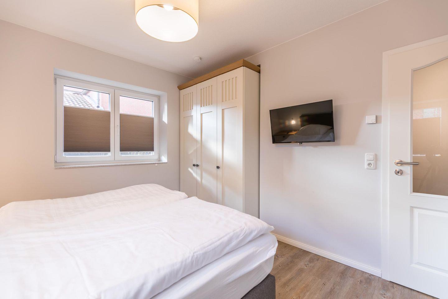 Im hellen Schlafzimmer - mit eigenem TV - finden Sie auf dem großen Boxspringsdoppelbett einen erholsamen Schlaf.