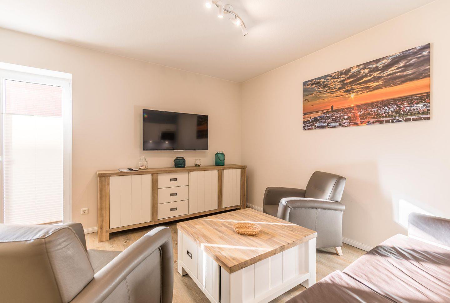 Die moderne Ferienwohnung im Erdgeschoss des Hauses Sand und Meer in Büsum bietet auf 60 m² eine komfortable Ausstattung mit offener Küche, Spülmaschine, WLAN, Bad mit Dusche und Badewanne sowie einer geschlossenen Terrasse mit Gartenmöbeln. Ein Privatparkplatz, eine behargliche Einrichtung und die Nähe zum Strand (nur 150 m) sorgen für einen entspannten Aufenthalt.