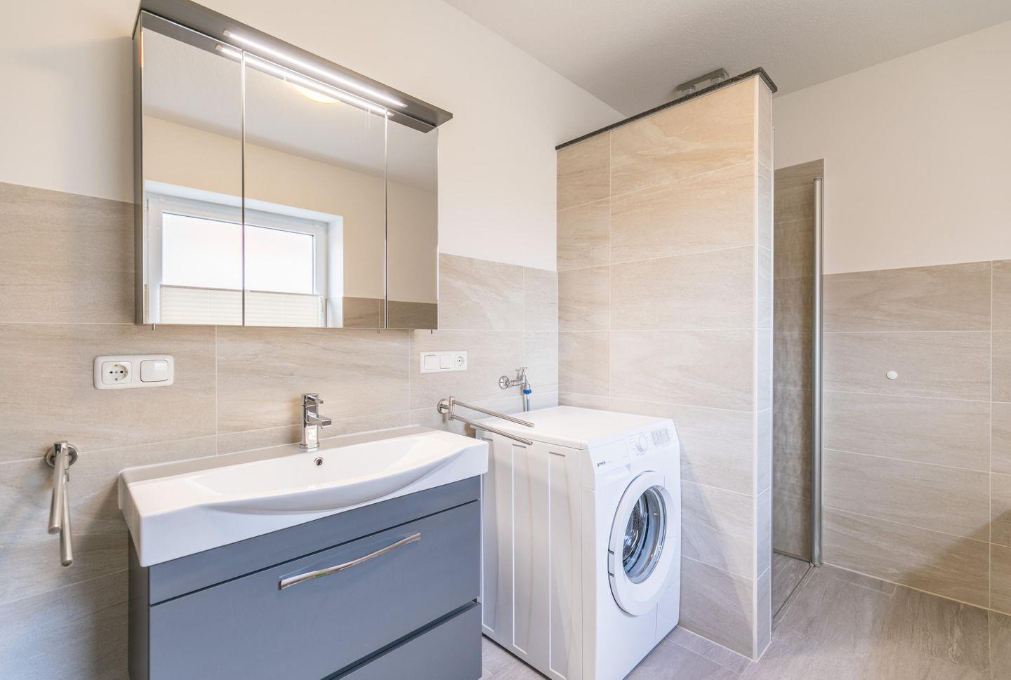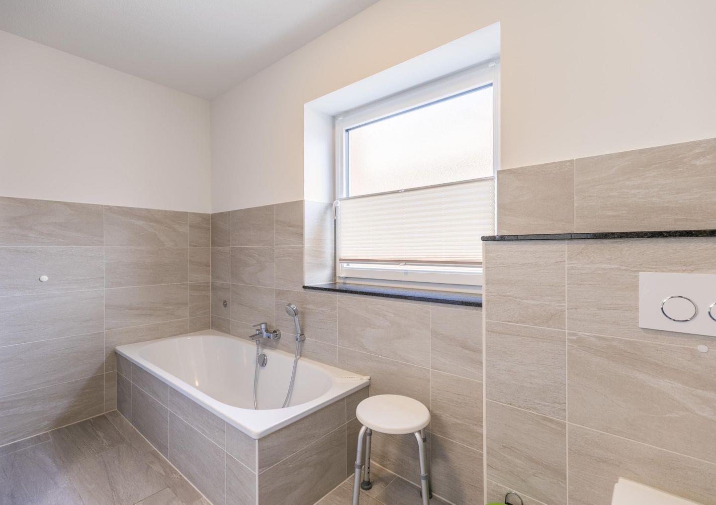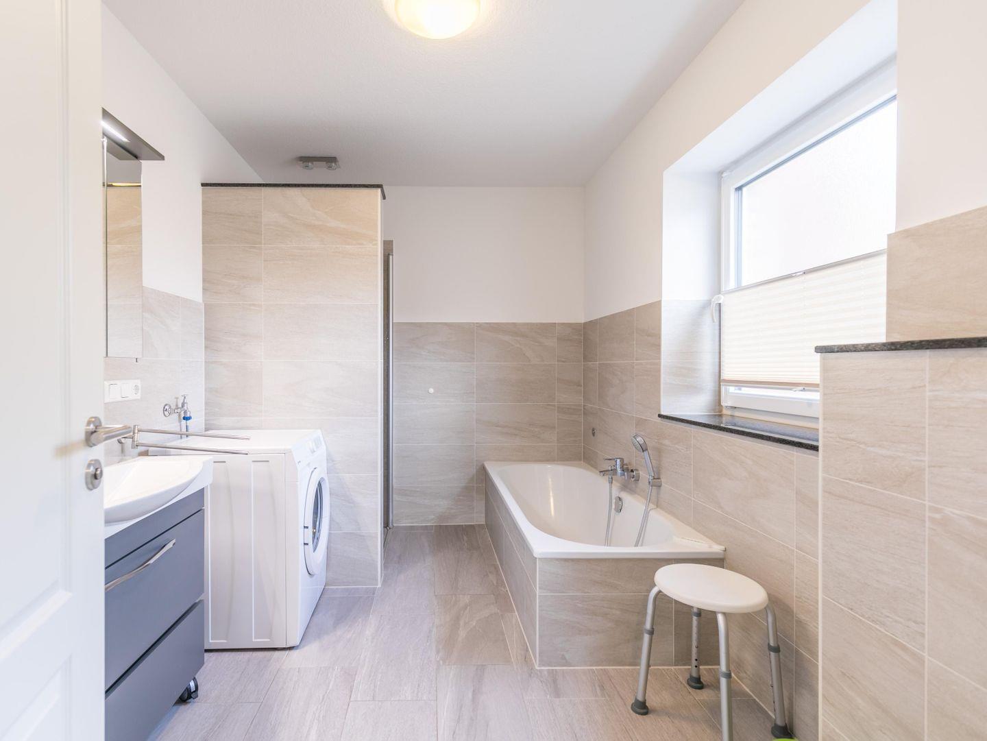 Badewanne, Dusche, Handtuchtrockner, WC, Spiegelschrank, Schränke, Fön, Plissee