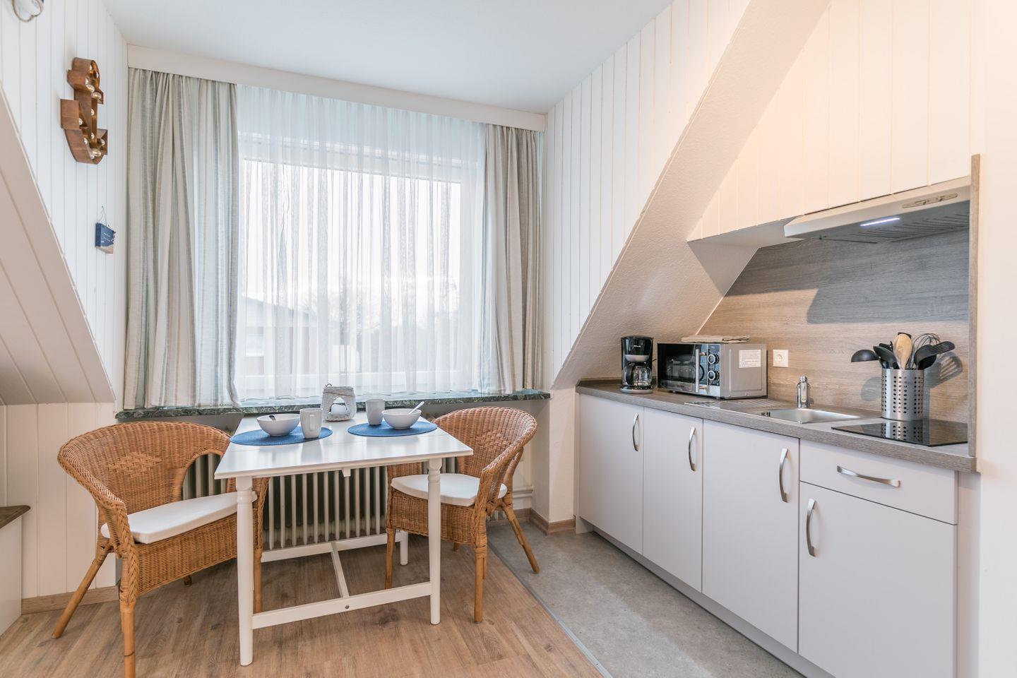 Die Ferienwohnung mit maritimem Flair. Der gemütliche Wohnraum lädt zum Verweilen ein. Helle Farben und ansprechende Möbel sorgen für ein behagliches Wohnklima. Auf dem großen Flachbildfernseher können Sie gemütlich fernsehen und auf dem Sofa den Abend entspannt ausklingen lassen. Die neue Pantry-Küche ist modern und zweckmäßig eingerichtet. Im kleinen Bad finden Sie alles für die tägliche Hygiene.