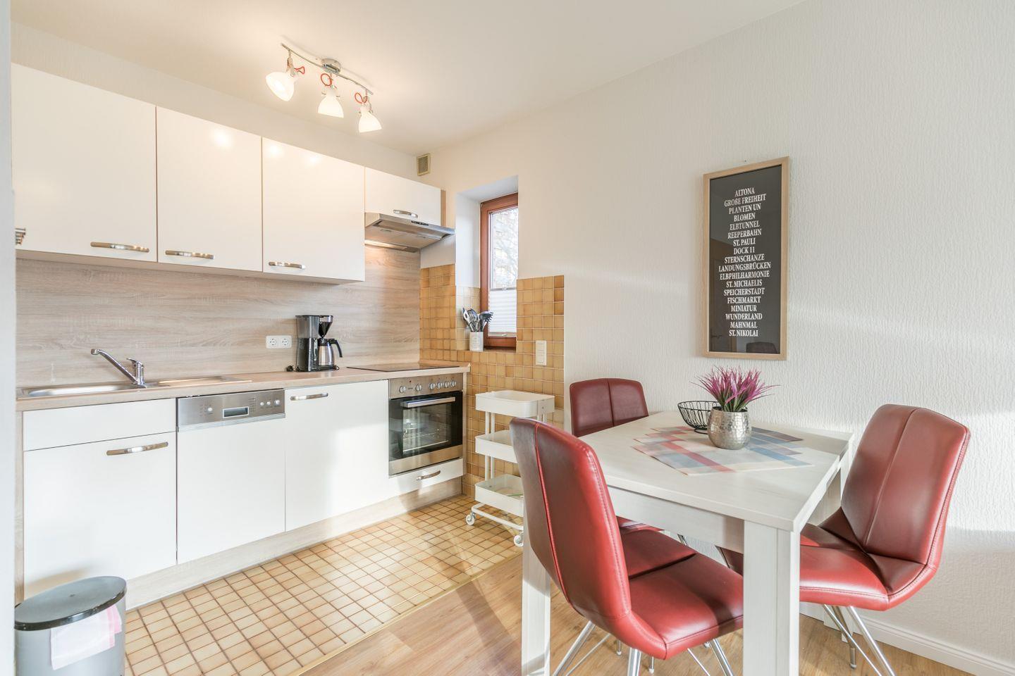 Ceranfeld, Backofen, Kühlschrank mit Gefrierfach, Geschirrspüler, Dunstabzug, Kaffeemaschine, Wasserkocher, Toaster, Eierkocher, Fenster
