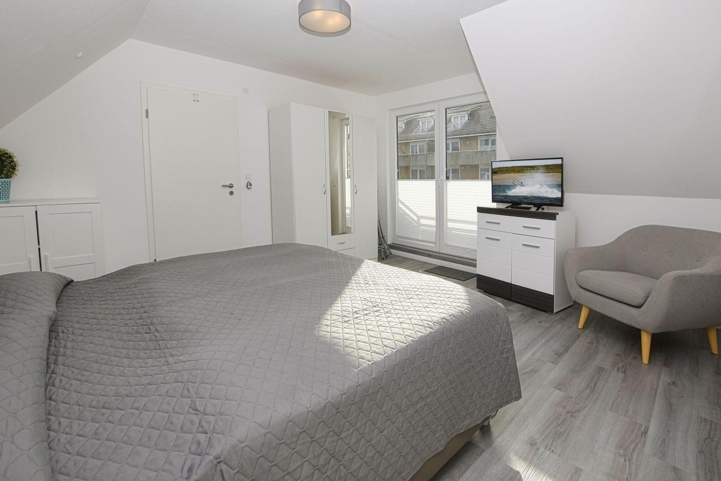 Boxspringdoppelbett mit durchgehender Matratze (1,80x2,00m), Schrank, Kommode, Flachbild-TV, Zugang zum Balkon