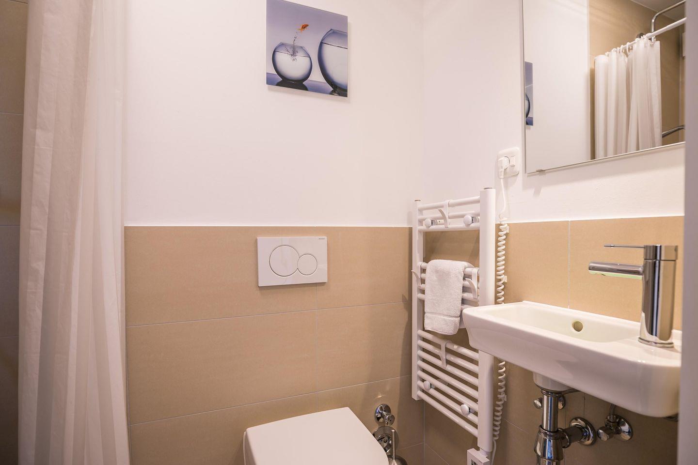 Dusche, WC, Waschbecken, Handtuchwärmer, Spiegel, Fenster