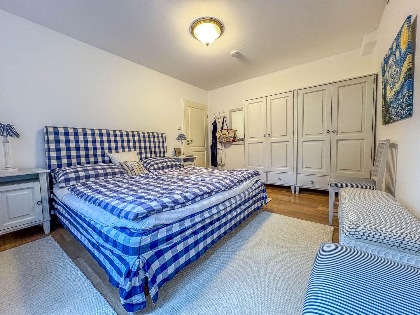 Der Hafen, der Hauptstrand, das Zentrum und der Bahnhof sind nur wenige Gehminuten entfernt. Die 2-Zimmer-Wohnung für zwei Personen setzt auf helle Sandtöne und skandinavische Gemütlichkeit. Das Herzstück ist das Hästens-Boxspringbett aus Naturmaterialien. Im Schlafzimmer befindet sich außerdem ein wandhängender Fernseher. Der Wohnbereich ist klar und behaglich eingerichtet. Im Garten erwarten Sie Sitzplätze zwischen Brunnenanlage und Teichbiotop. Eine Terrasse lädt zum Frühstück in der Sonne ein. Die Küche ist vollständig ausgestattet und macht Selbstversorgung leicht. Im Duschbad starten Sie dank Fußbodenheizung und Handtuchwärmer angenehm in den Tag.