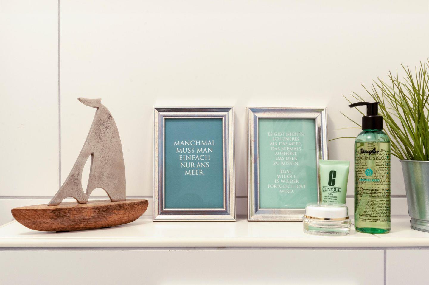 WC, Spiegelschrank, bodentiefe Dusche, Handtuchtrockner, Föhn, Abluft