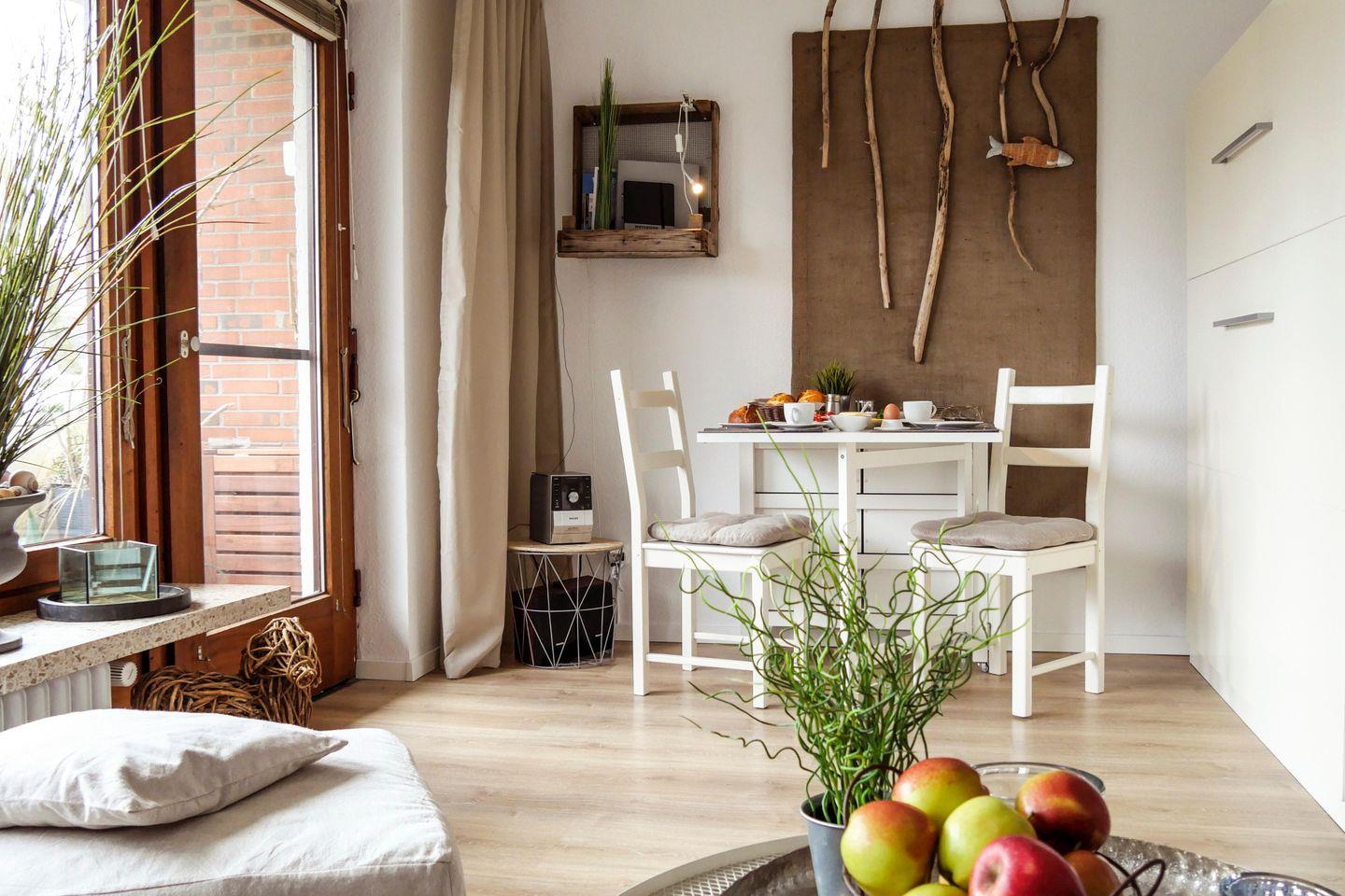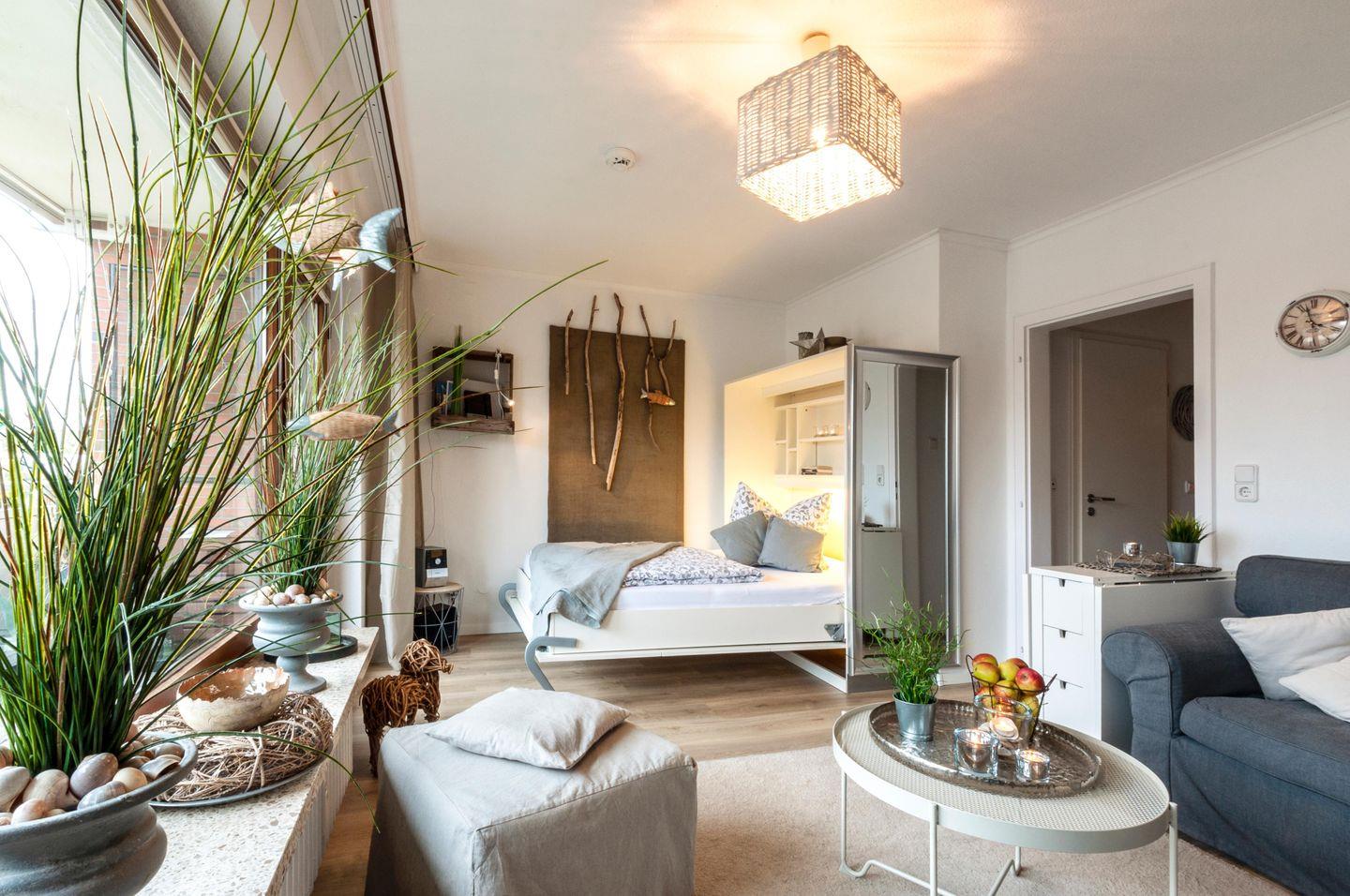 Das behagliche Wohnzimmer ist dekorativ eingerichtet und hat zudem eine zusätzliche Schlafmöglichkeit in Form eines Schrankbettes für das Kind. Die Küche ist neu und mit allem ausgestattet was Sie für Ihren Urlaub benötigen.