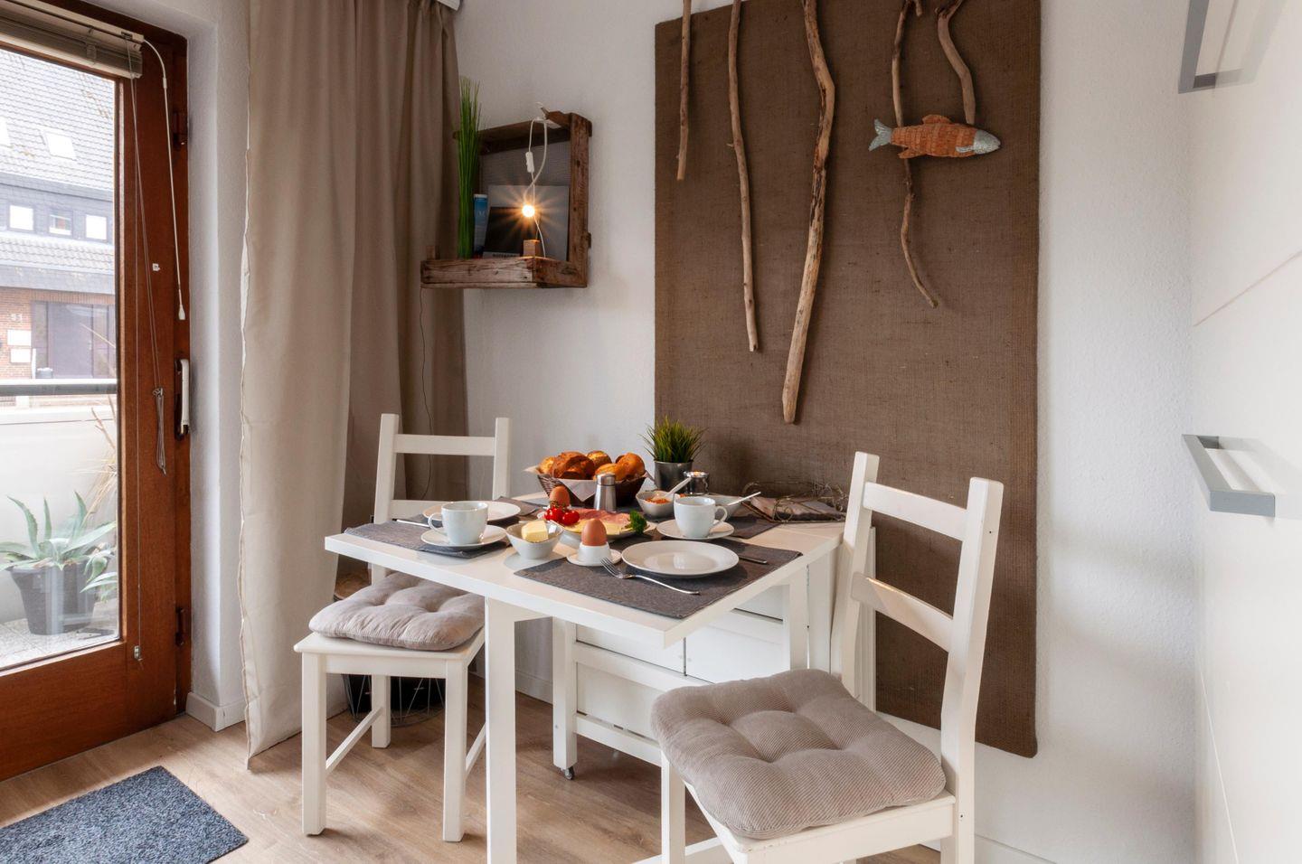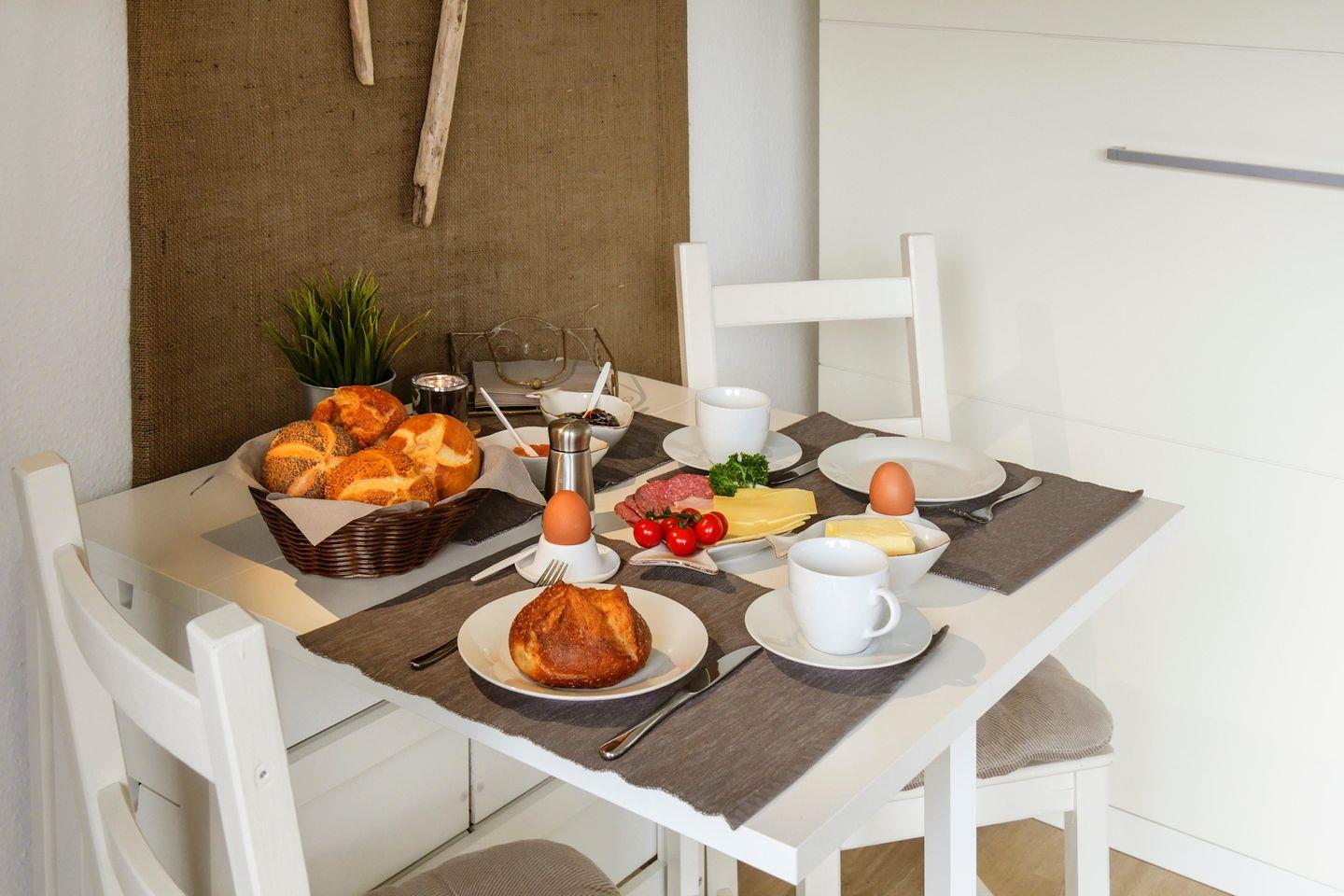 möblierter Balkon, Strandkorb, Bettwäsche inklusive, Handtücher selbst mitbringen, 1 kostenfreier Parkplatz, Garderobe, Abstellkammer, W-LAN (HotSpot)