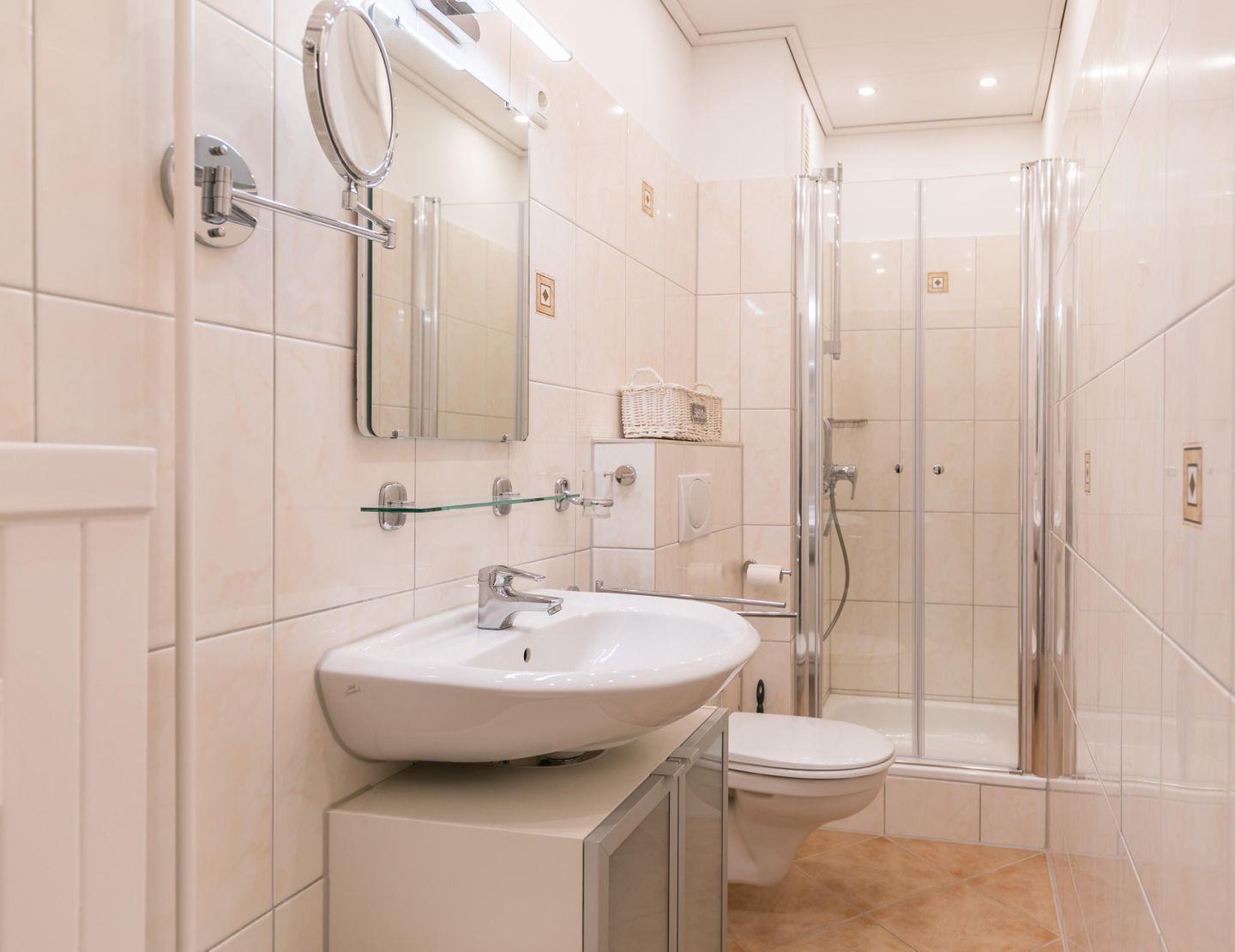 Duschbad, WC, Spiegel, Waschbecken, Handtuchtrockner