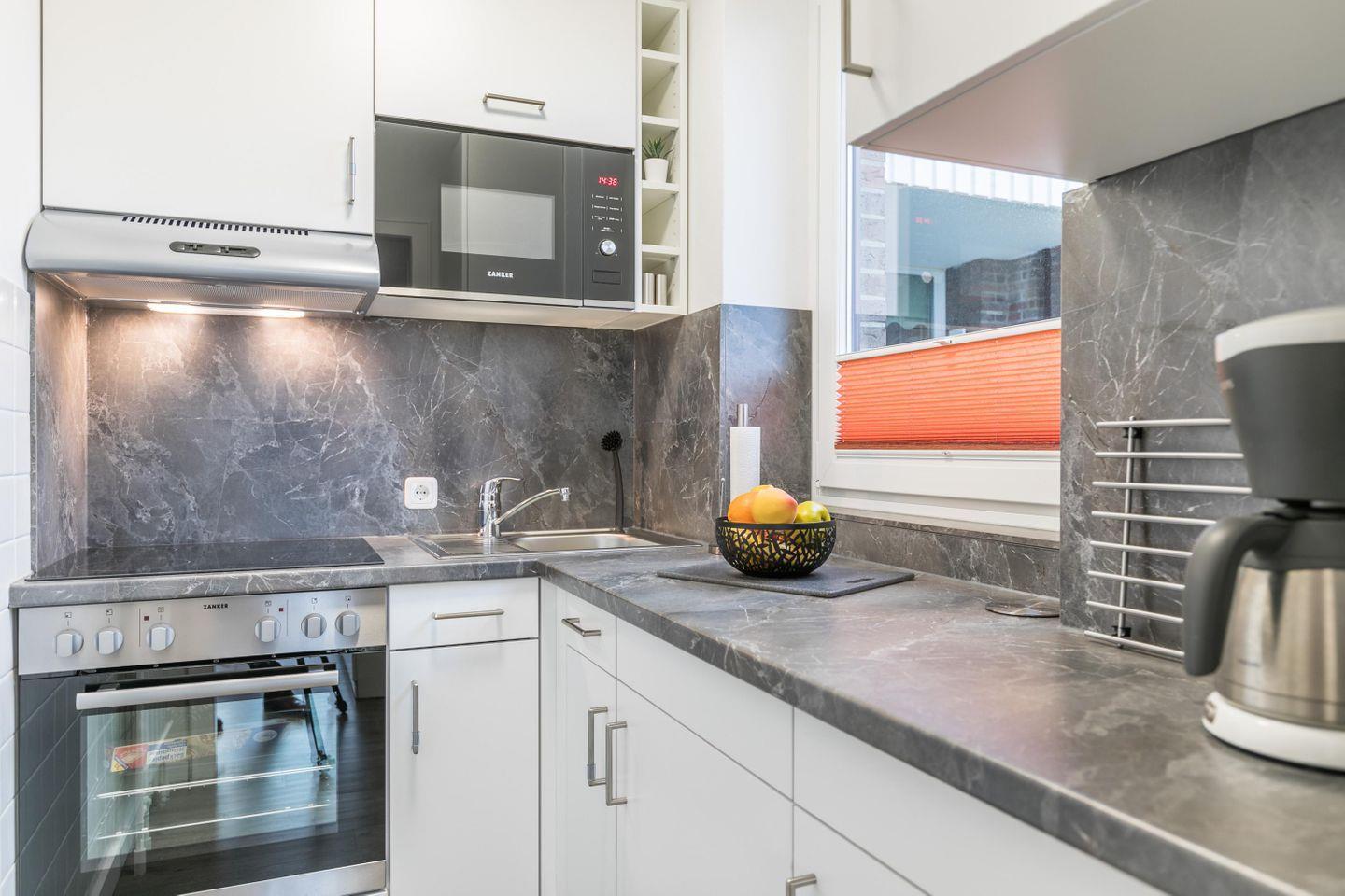 Kochnische, Kühlschrank m. Gefrierfach, Ceranfeld, Backofen, Mikrowelle, Toaster, Wasserkocher, Kaffeemaschine, Eierkocher
