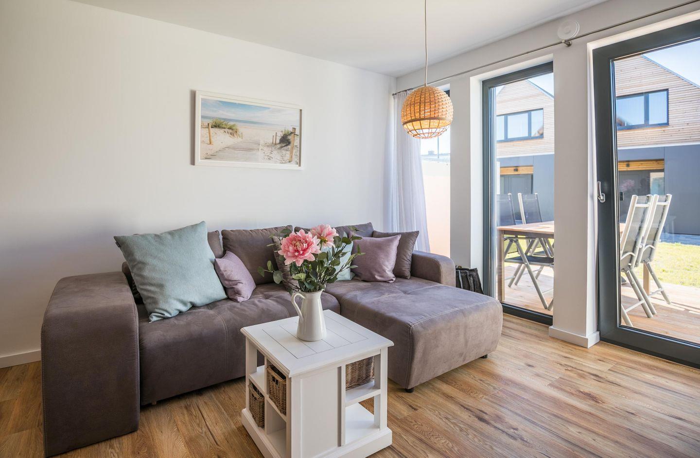 Modern eingerichtet macht der Name Strandkoje den Räumlichkeiten alle Ehre und bietet Platz für 4 Personen- Im Erdgeschoss befinden sich neben der voll ausgestatteten Küche, ein zur Küche offener Wohnraum. Gemütliche Polstermöbel machen es so richtig lauschig. Von hier aus haben Sie auch Zugang zur Terrasse.