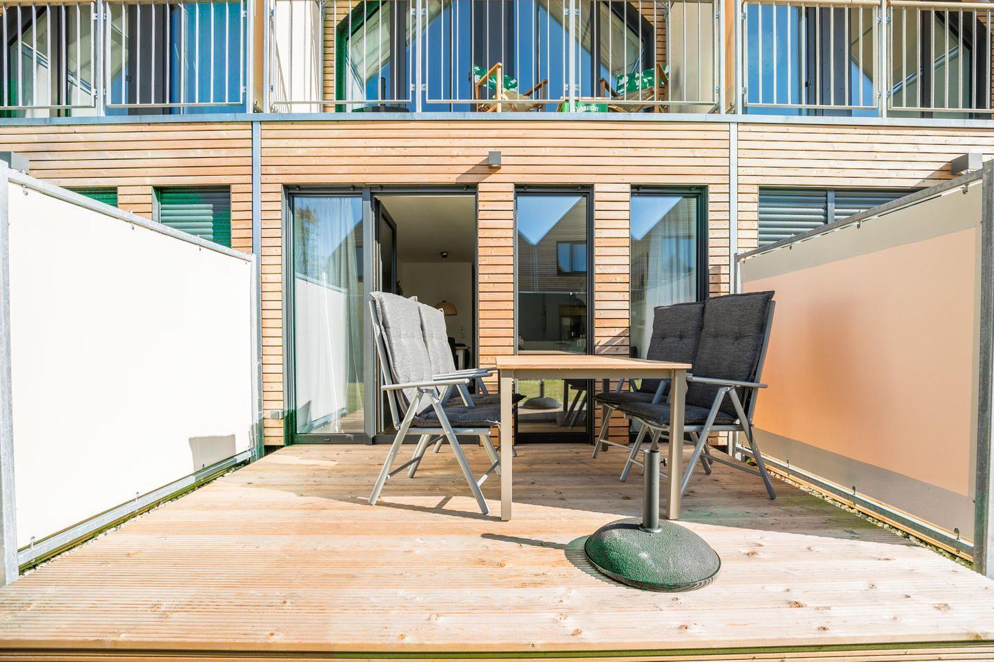 1 kostenloser Parkplatz, W-LAN, Waschmaschine, Terrasse mit 4 Gartenstühlen und Auflagen, kleiner Balkon mit Stühlen, Be- und Entlüftungsanlage, Garderobe, Abstellraum, Fußbodenheizung, Wäsche optional dazu buchbar