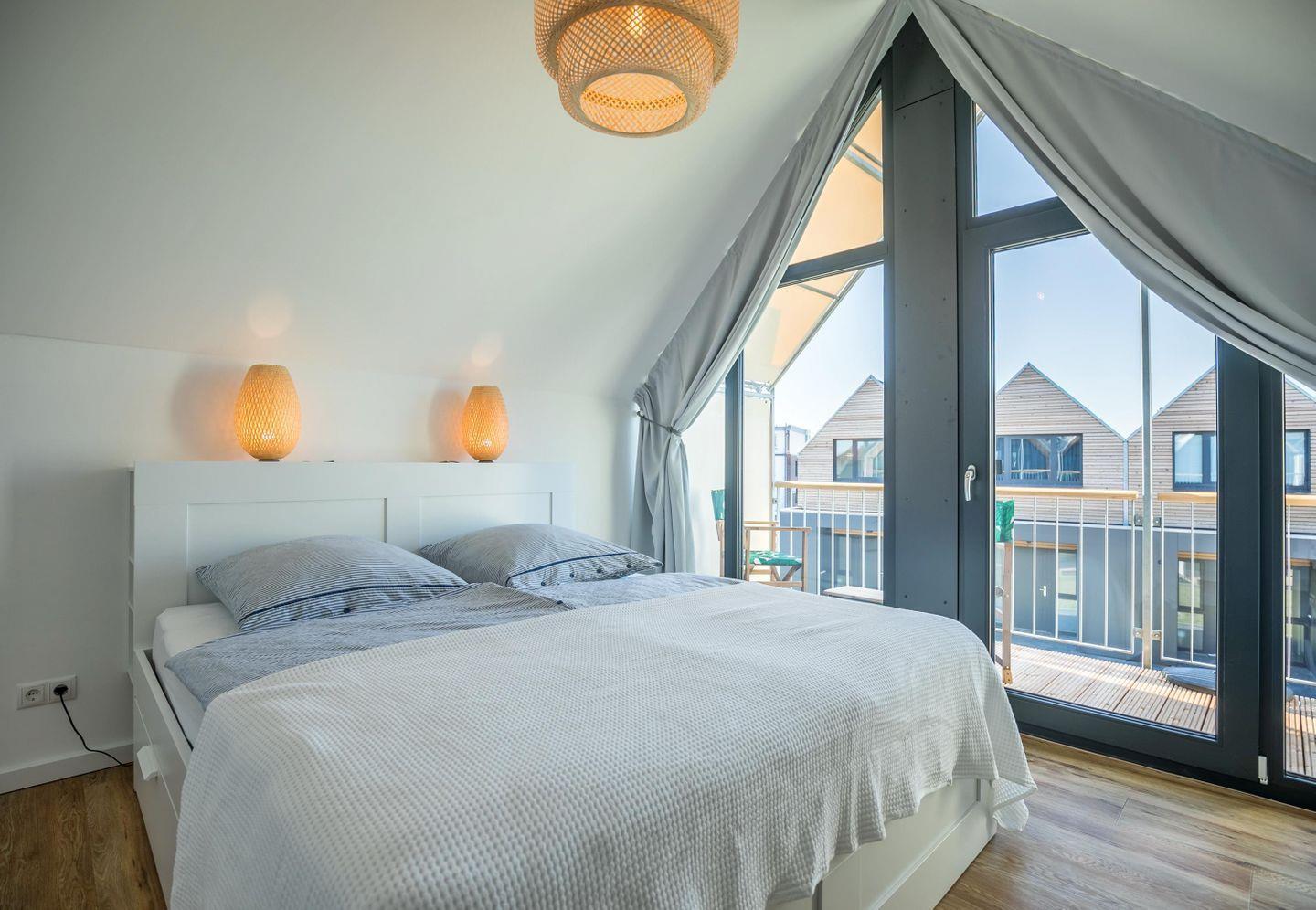 Im Obergeschoss liegen die beiden Schlafzimmer. Im lichtdurchfluteten großen Schlafzimmer steht ein Doppelbett, ein Flachbild-TV und Sie können auf dem kleinen Balkon die Abendsonne genießen. Das zweite Schlafzimmer ist passend mit 2 Einzelboxspringbetten ausgestattet.