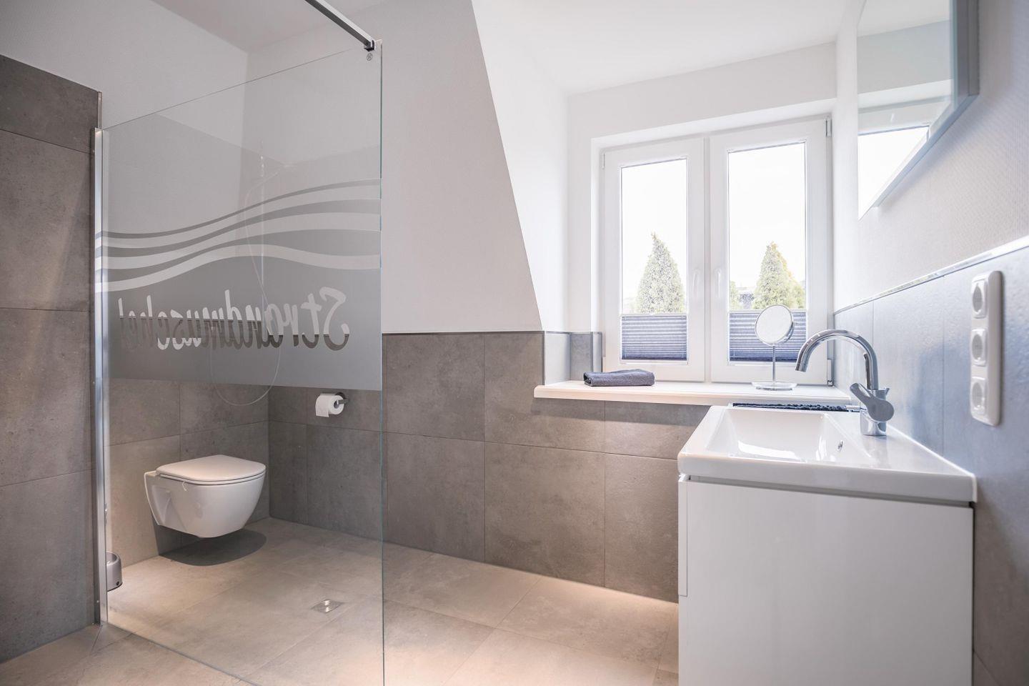 beleuchteter Spiegel, WC, Waschbecken, bodentiefe Dusche, Kosmetikspiegel, Fenster