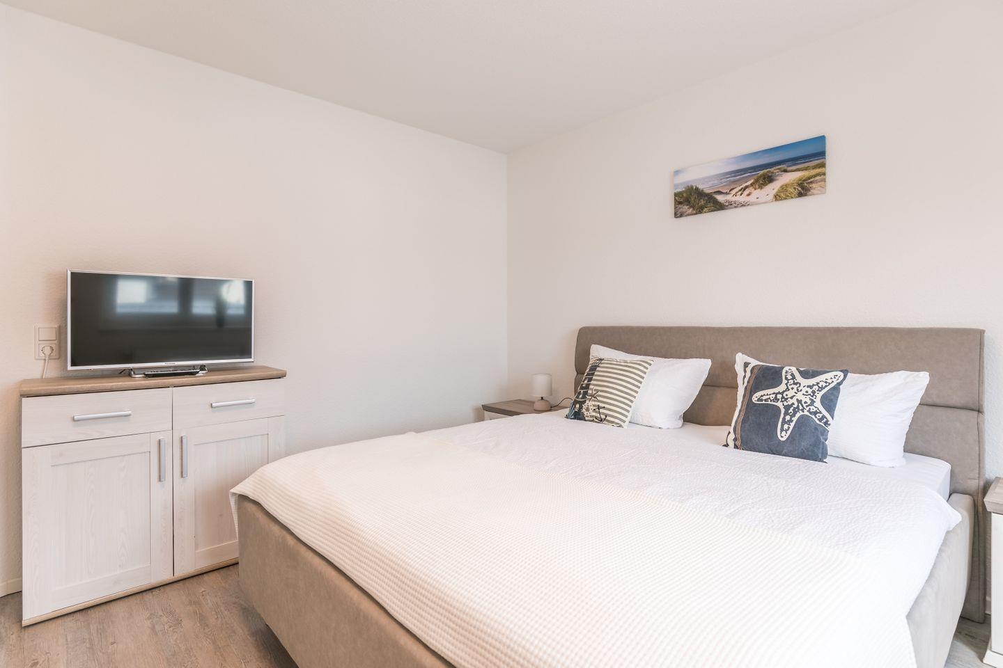 Doppelbett mit getrennten Matratzen (2,00m x 0,90m), Nachttische und Lampen, 3-türiger Kleiderschrank, Kommode, Flachbild-TV, Verdunkelungsplissees