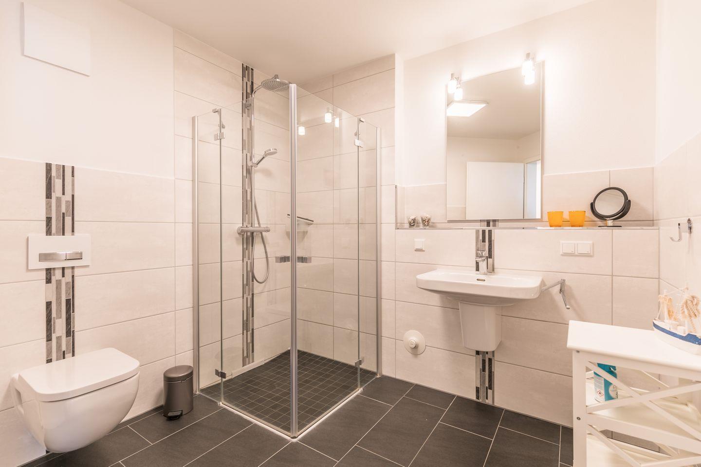 Bodentiefe Dusche, WC, Waschbecken, Spiegel, Föhn, Handtuchtrockner, Abluft