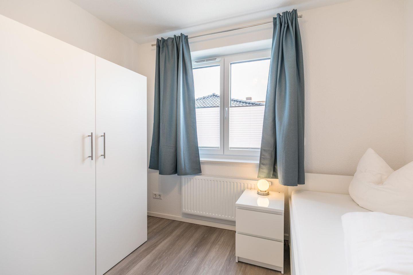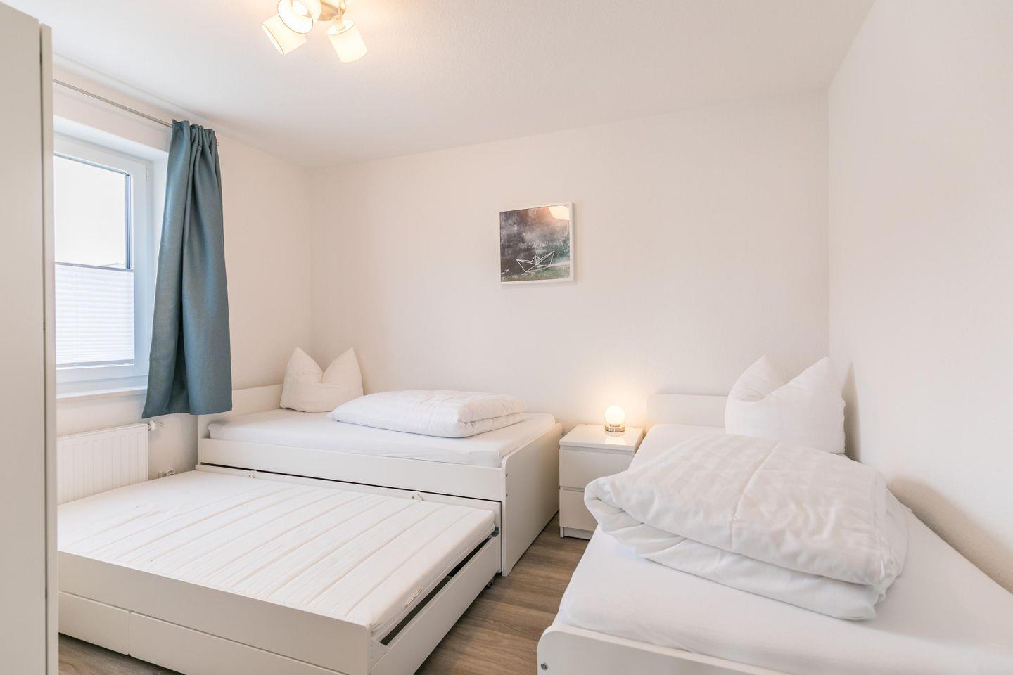 2 Einzelbetten und einer zusätzlich ausziehbaren Matratze, Nachttische + Lampen, Kleiderschrank, Gardinen