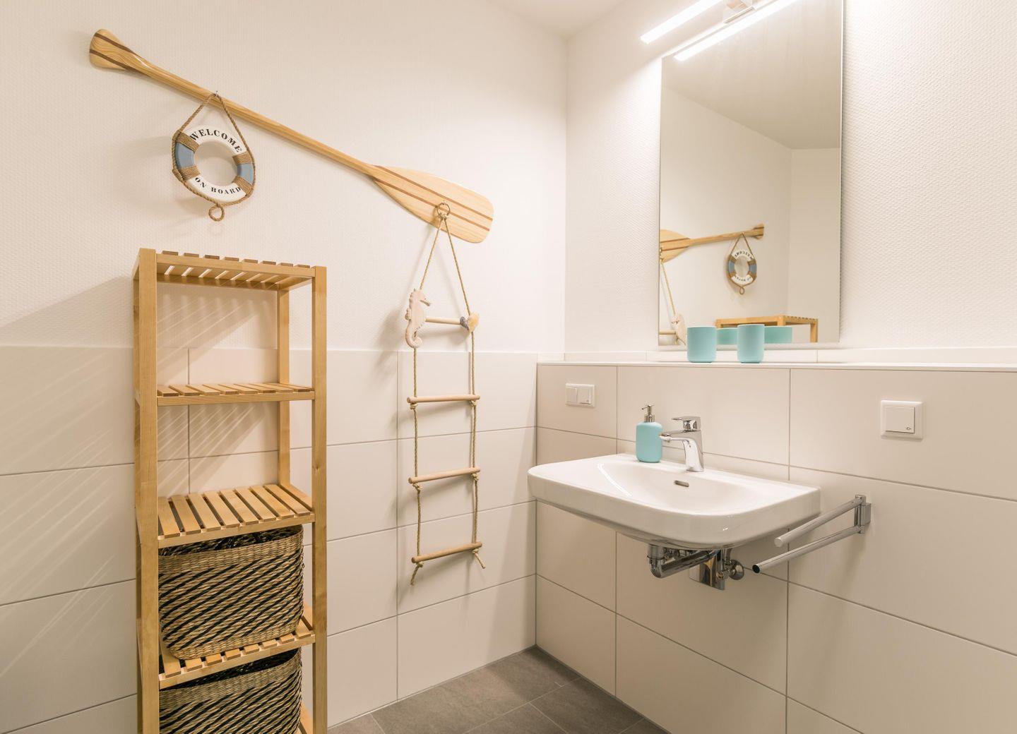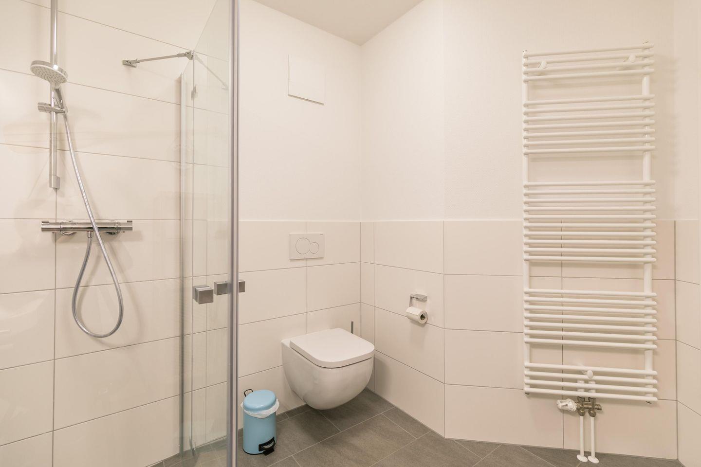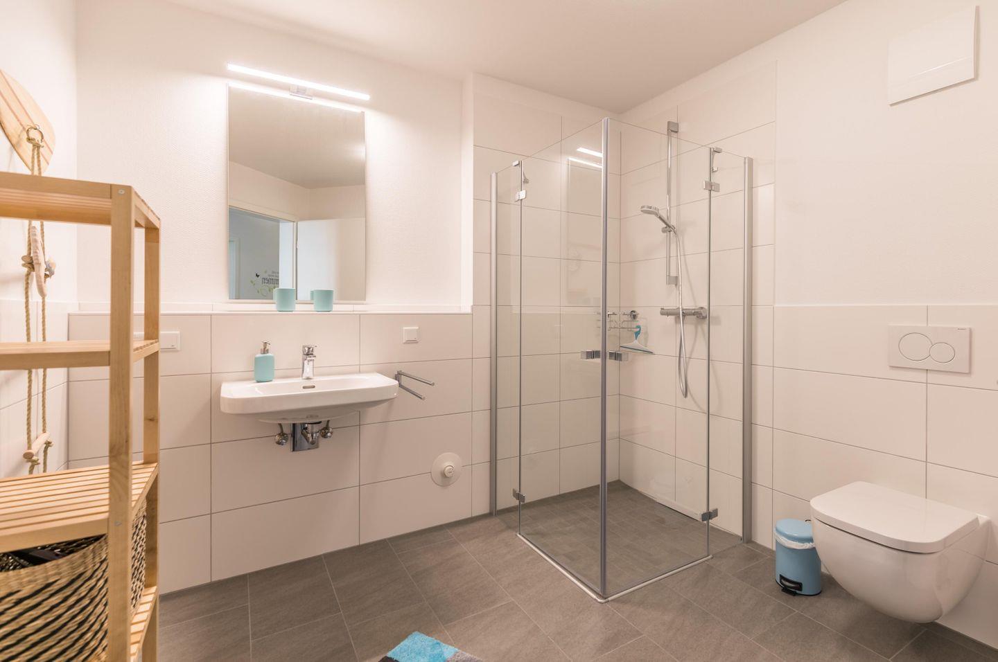 Bodentiefe Dusche, WC, Waschbecken, Spiegel, Abluft, Handtuchtrockner, Fußbodenheizung, Fön, beleuchteter Kosmetikspiegel