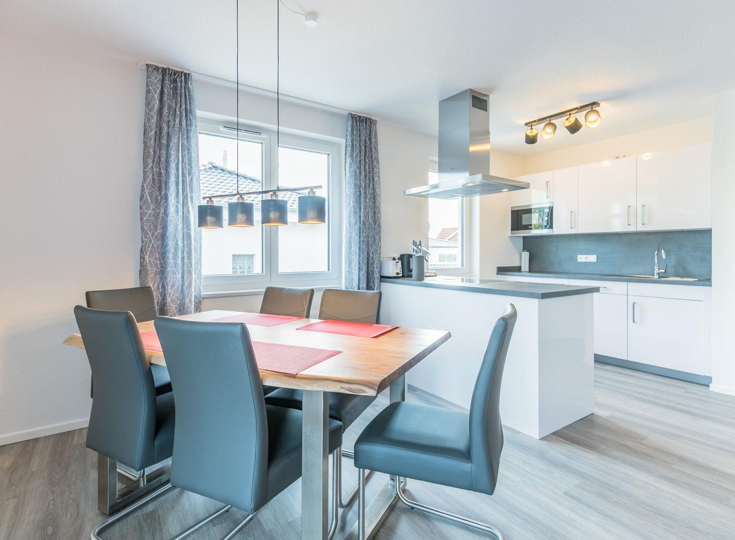 Der Küchenbereich ist in eine Küchenzeile und eine Kücheninsel mit Induktionskochfeld aufgeteilt, damit Sie sich ganz nach Ihren Wünschen und Vorstellungen einrichten können. Direkt daneben steht der massive Esstisch, der zum Verweilen einlädt.