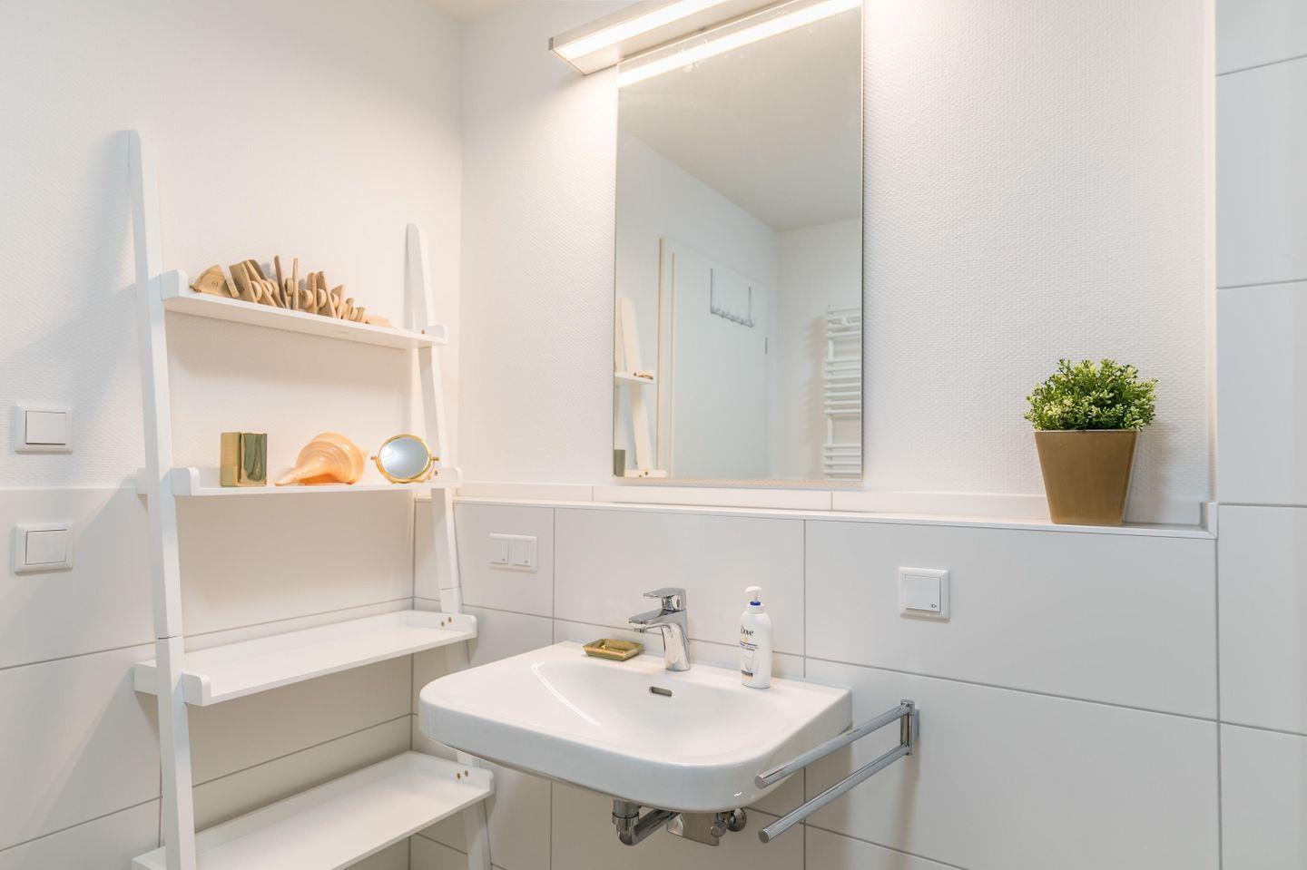 Bodentiefe Dusche, Waschbecken, WC, Föhn, Spiegel, Handtuchtrockner, Abluft