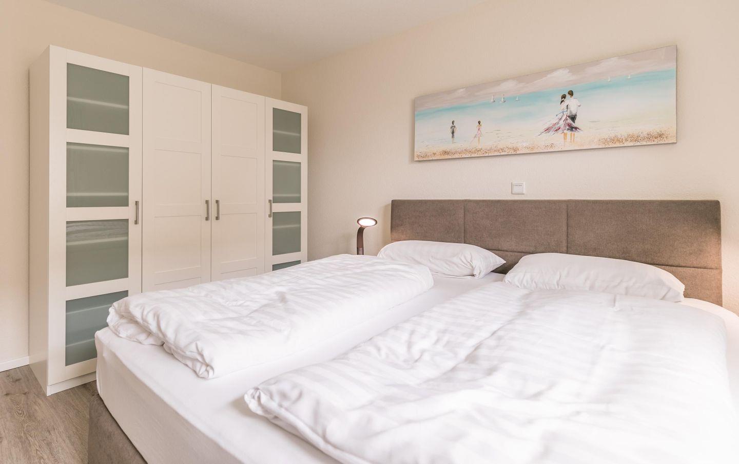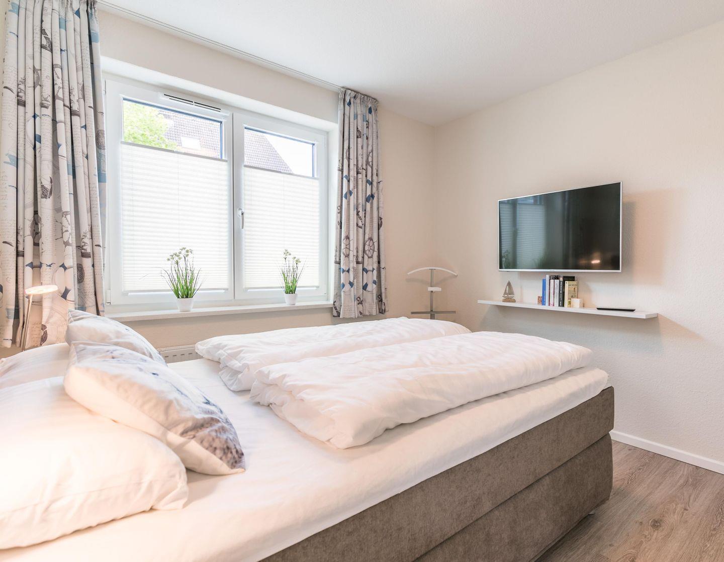 Boxspringdoppelbett mit durchgehender Matratze (2,00m x 1,80m), Nachttische + Lampen, großer Kleiderschrank, Flachbild-TV, Verdunkelungsvorhang + Plissee,