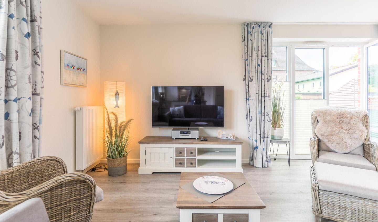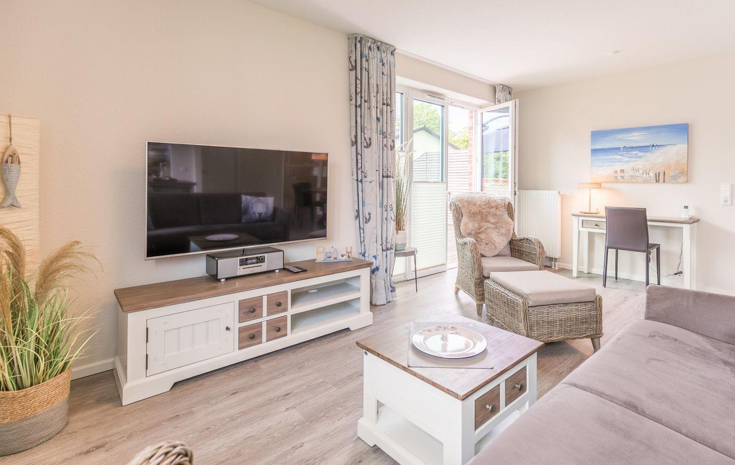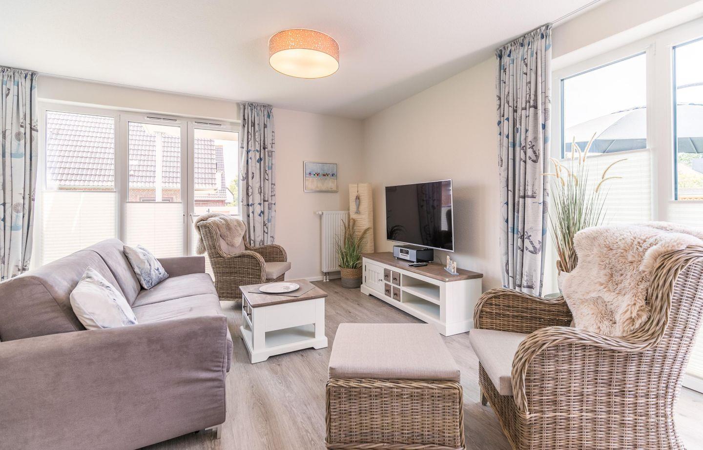 Der Wohnraum bietet Ihnen eine Couch, zwei Rattansessel mit Flatscreen-TV sowie eine Soundanlage, einen Essbereich und eine toll ausgestattete Küchenzeile.