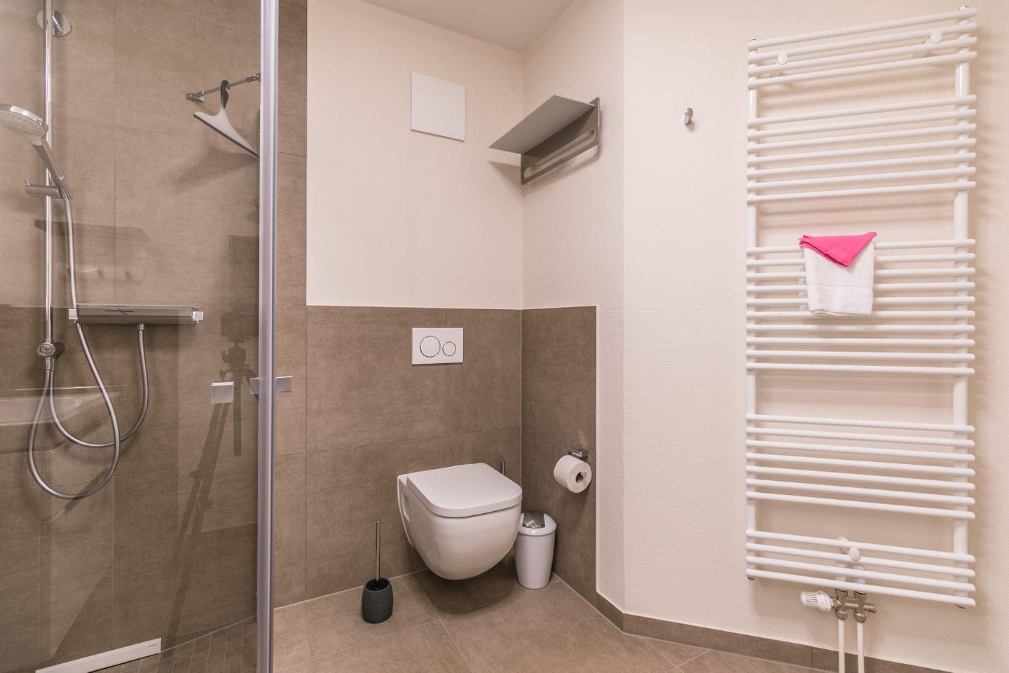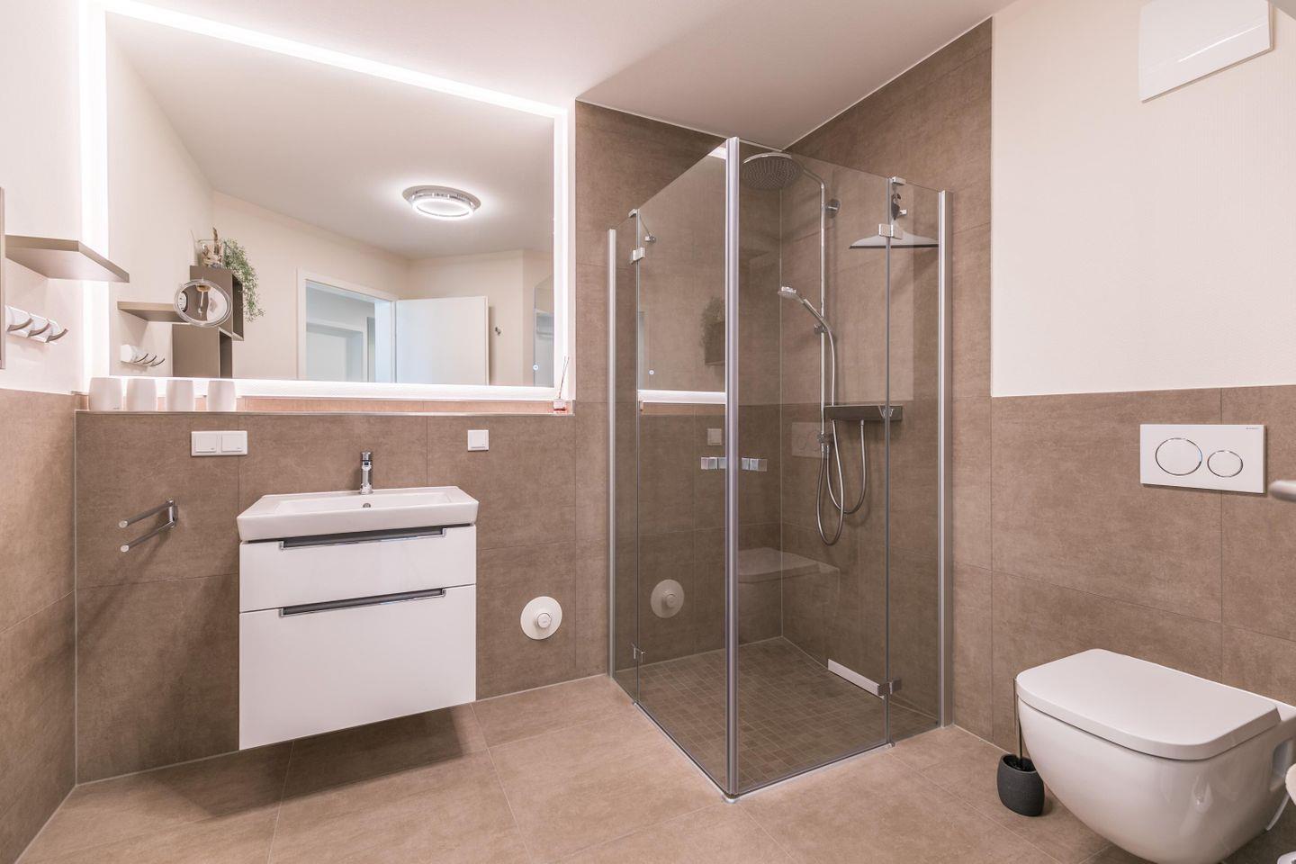 Bodentiefe Dusche mit Regenbrause, Duschhocker, WC, Waschbecken mit Unterschrank, Hängeschrank, Handtuchtrockner, Abluft, Föhn