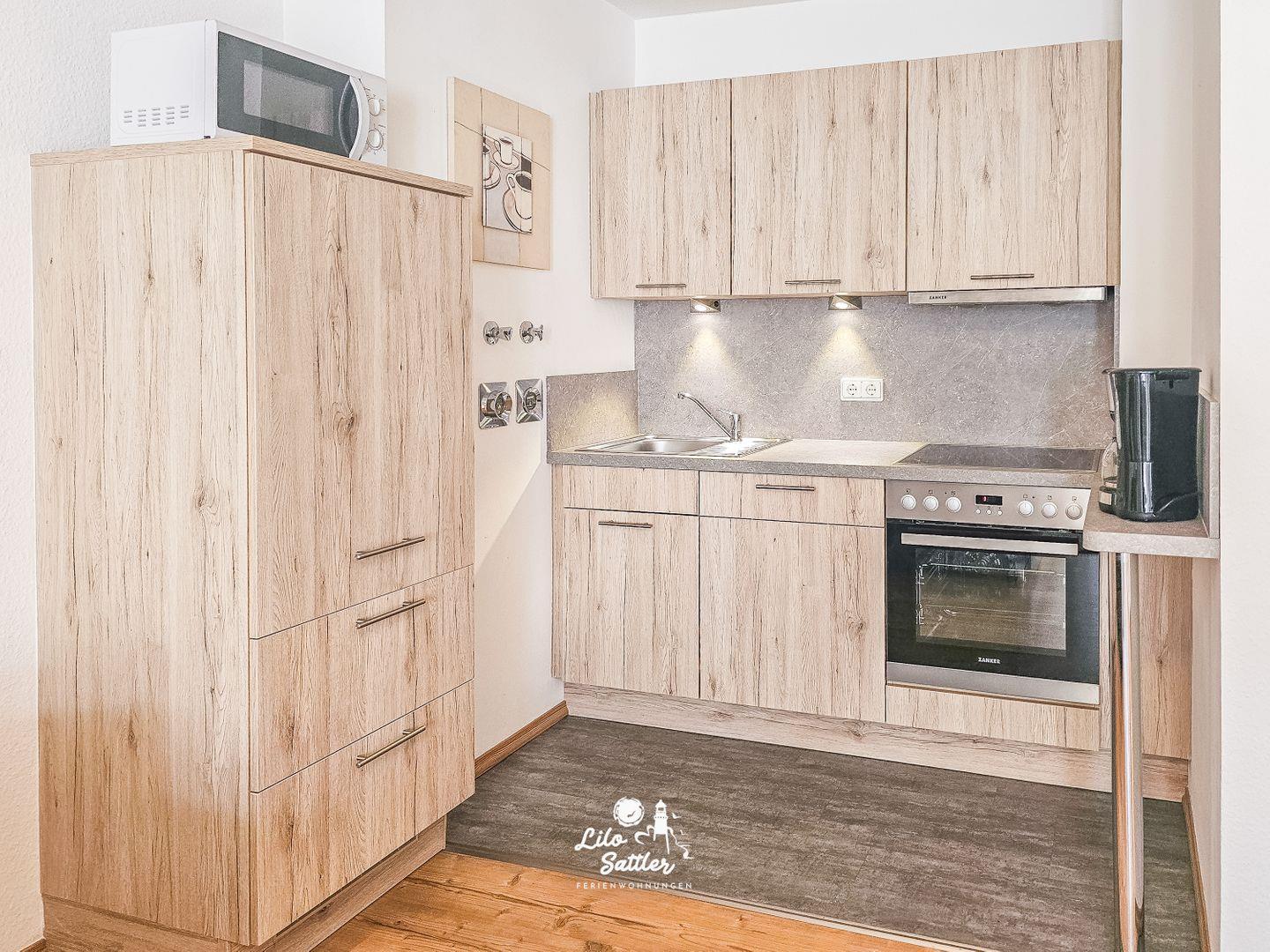 Ceranfeld, Backofen, Geschirrspüler, Kühlschrank m. Gefrierfach, Mikrowelle, Toaster, Wasserkocher, Kaffeemaschine, Abluft