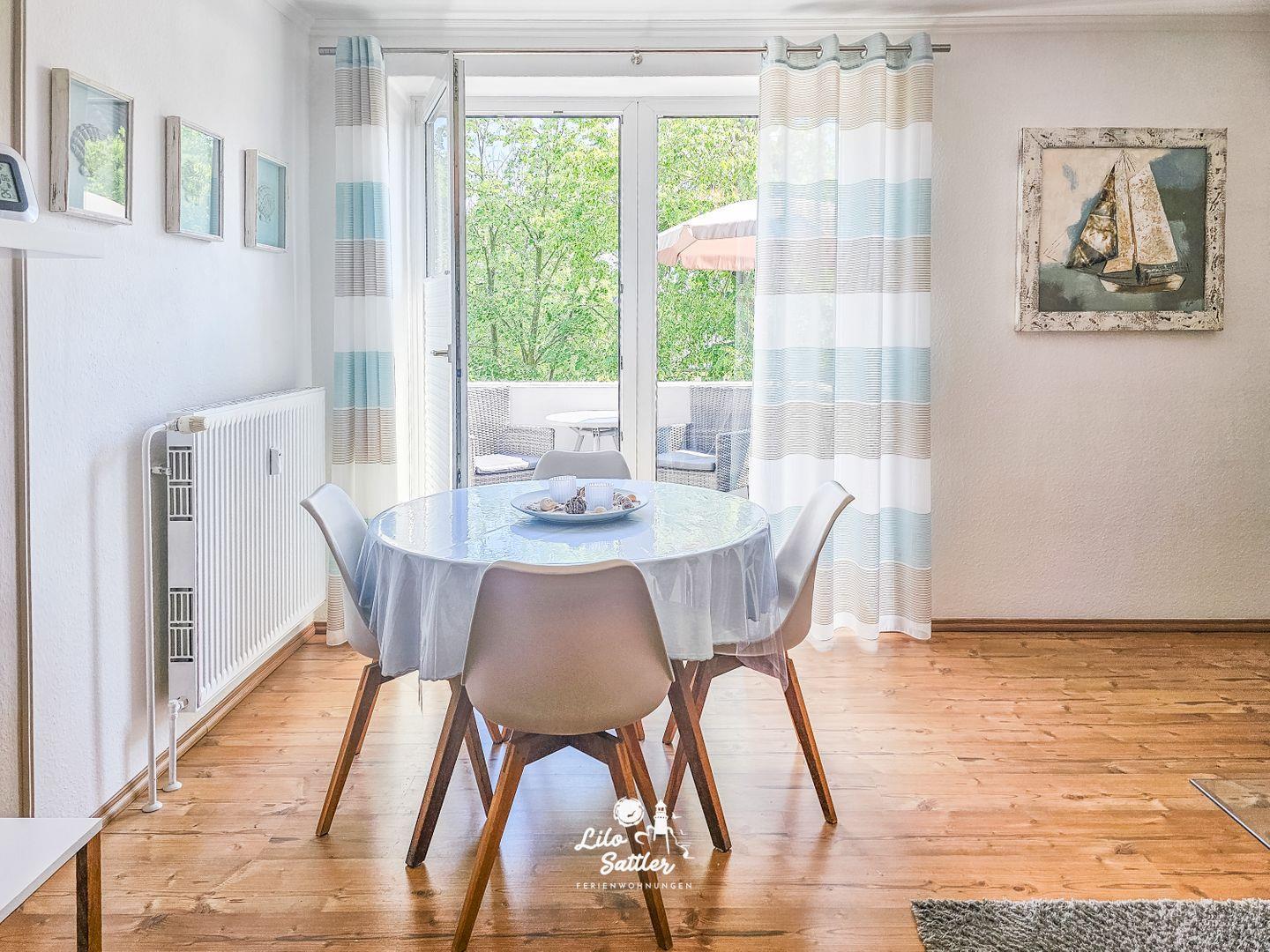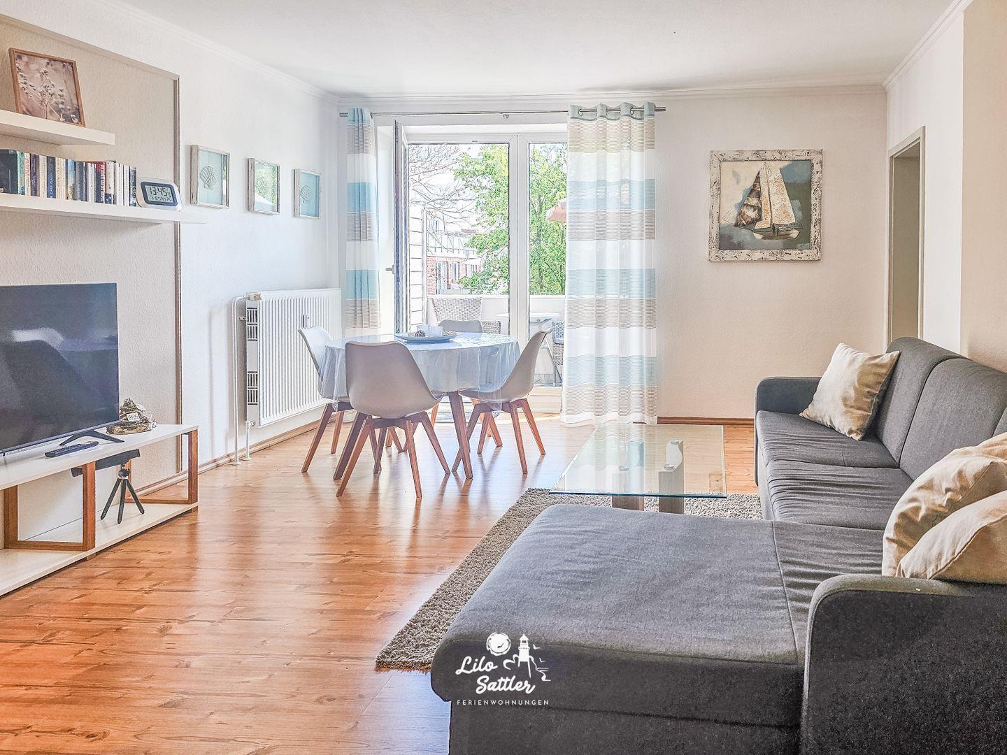 Schlafcouch, Flachbild-TV, Kommode, Esstisch mit 4 Stühlen, Zugang zum Balkon
