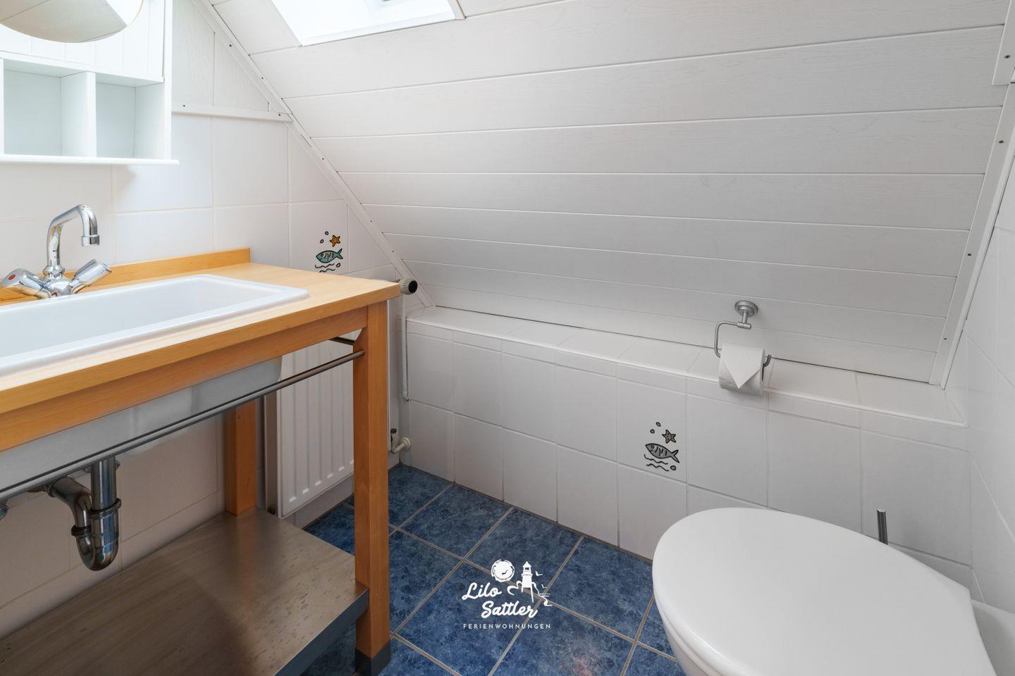 Dusche (flacher Einstieg), WC, Waschtisch, Spiegel, Föhn, innenliegend.