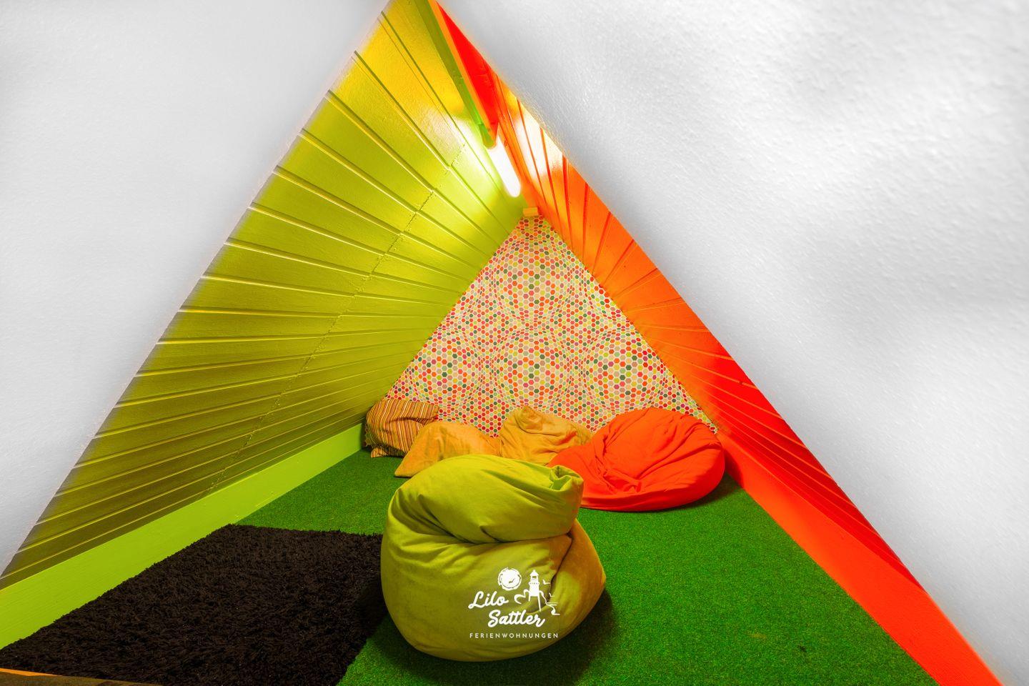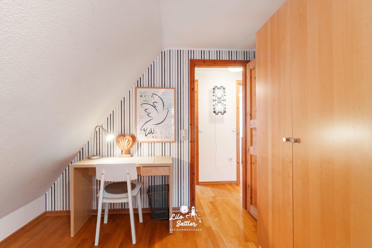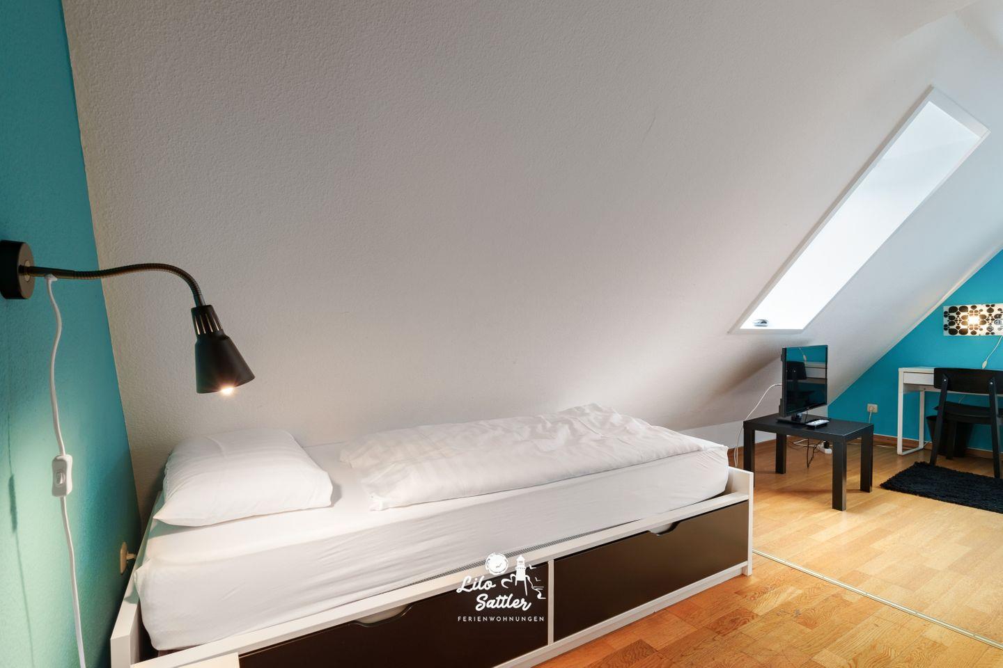 Bett 140×200 cm, zwei Wandschränke, Schreibtisch, Flachbild-TV, Zugang zum Spielboden.