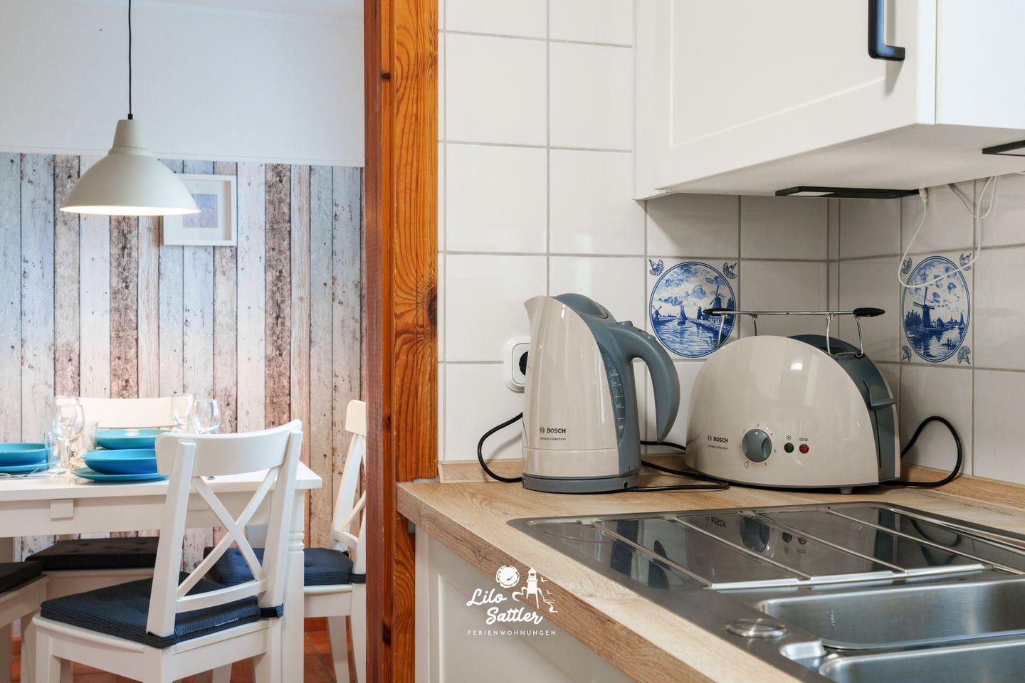 Ceran-Kochfeld, Backofen, Geschirrspüler, Kühlschrank, zusätzlicher Gefrierschrank, Mikrowelle, Kaffeemaschine, Wasserkocher, Toaster, Koch-/Essgeschirr.