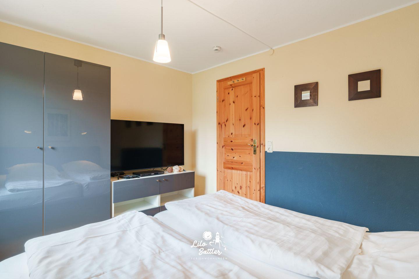 Doppelbett 180×200 cm, Kleiderschrank, Nachttische/Leuchten, LCD-TV.
