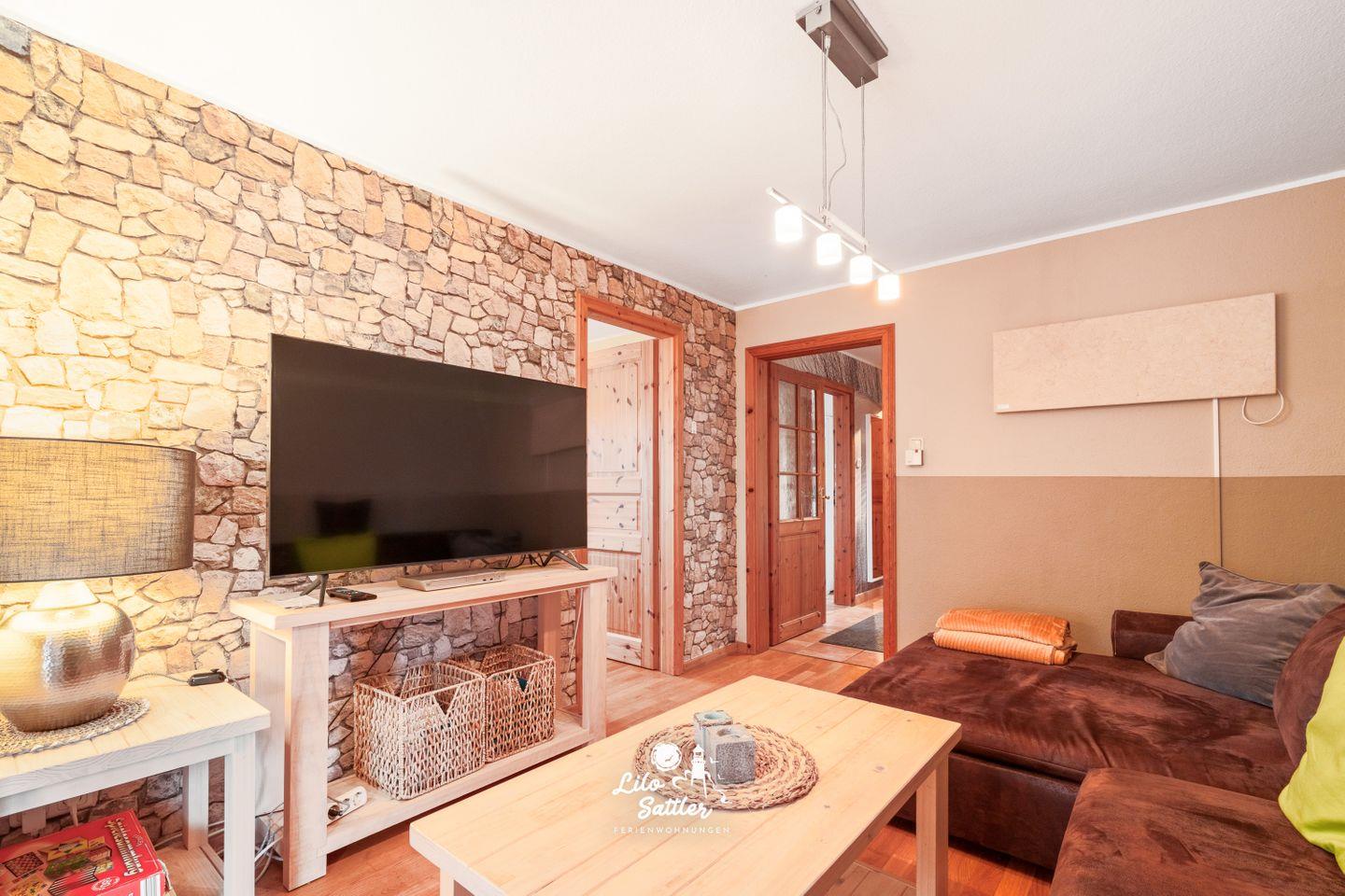 Sofa-Sitzecke, Couchtisch, TV, Esstisch; Zugang zur Terrasse/Garten.