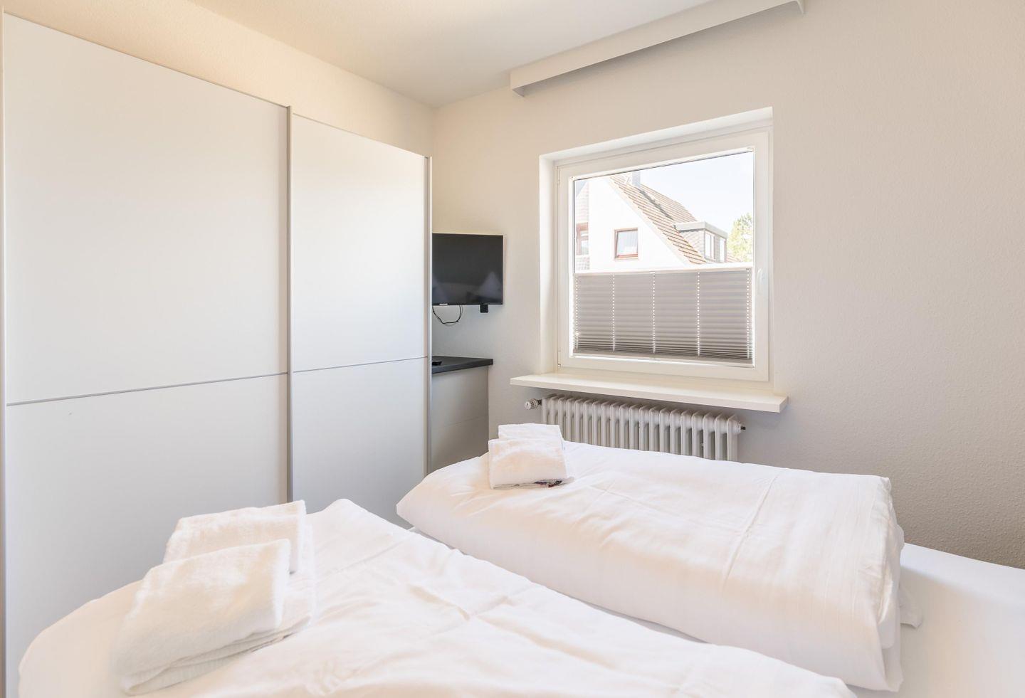 Doppelbett (1,80x2,00m) mit Nachttischen und Lampen, Lattenrost Kopf- und Fußteil höhenverstellbar, Kleiderschrank, Flachbild-TV, Verdunkelungsplissee, Schranktresor