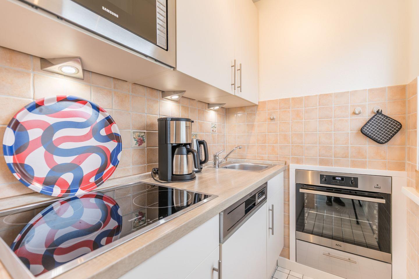 Backofen, Ceranfeld, Geschirrspüler, Kühlschrank mit Gefrierfach, Kaffeemaschine, Wasserkocher, Toaster, Dunstabzugshaube, Mikrowelle, Esstisch mit 4 Stühlen