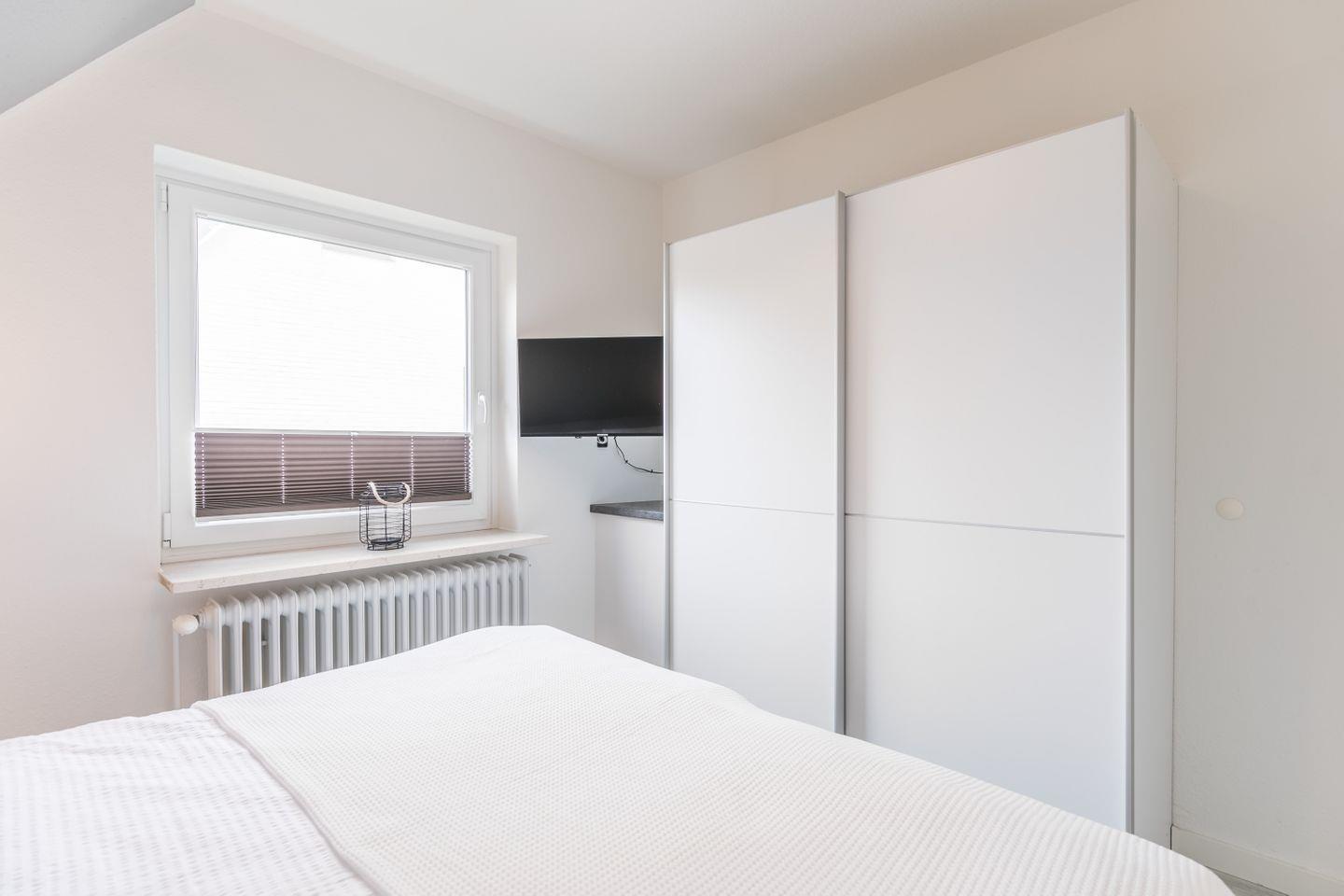 Doppelbett (1,80x2,00m) mit Nachttischen und Lampen, Lattenrost Kopf- und Fußteil höhenverstellbar, Kleiderschrank, Flachbild-TV, Verdunkelungsplissee, Schranktresor