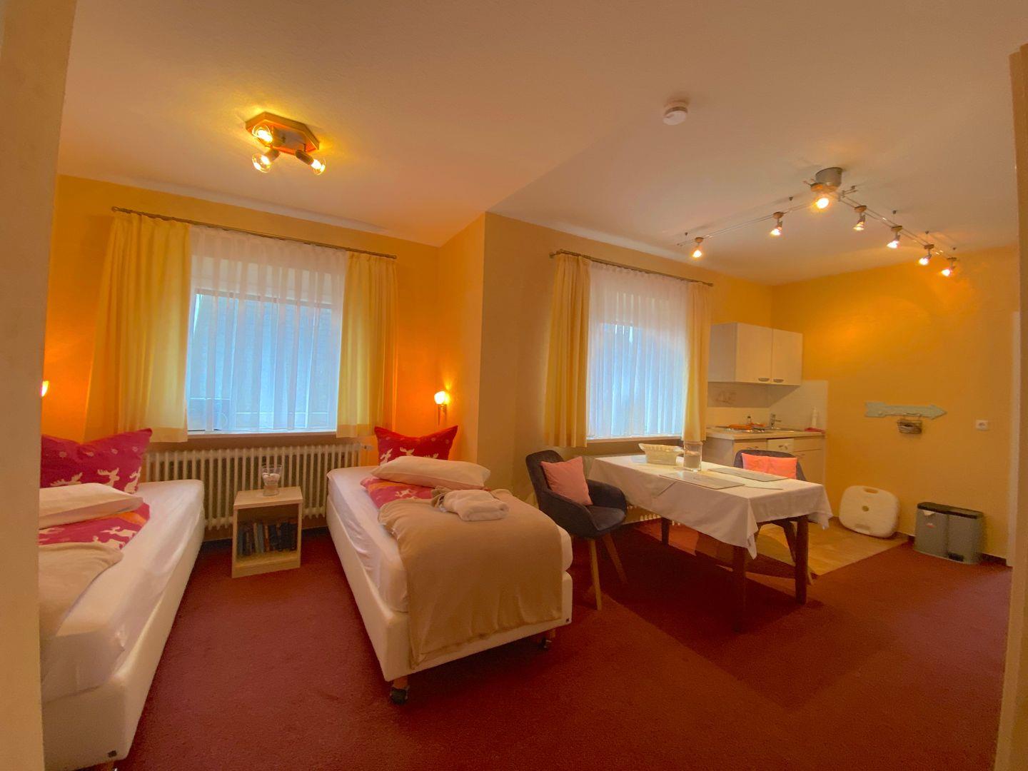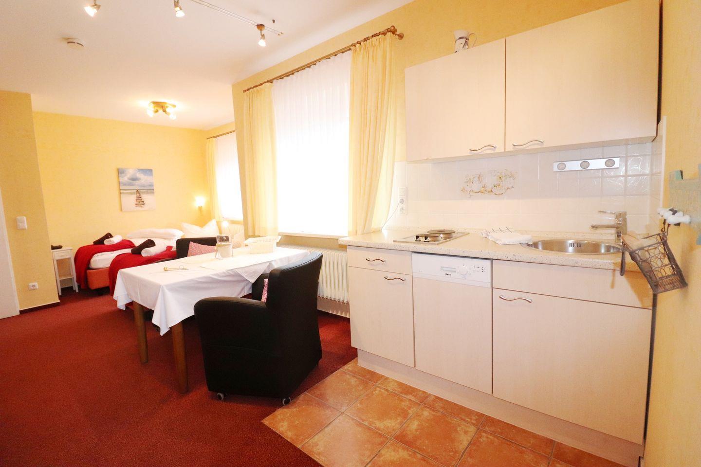 Die ruhige, gemütliche 1-Raum-Ferienwohnung in der 1. Etage hat jetzt einen Balkon (Richtung Parkplatz) mit Blick in den Kurpark und ein neues, geräumiges Bad mit Fenster bekommen. Geschirrspüler, Wasserkocher, Kaffeemaschine und Toaster, sowie Geschirr und Besteck für den täglichen Bedarf sind vorhanden.