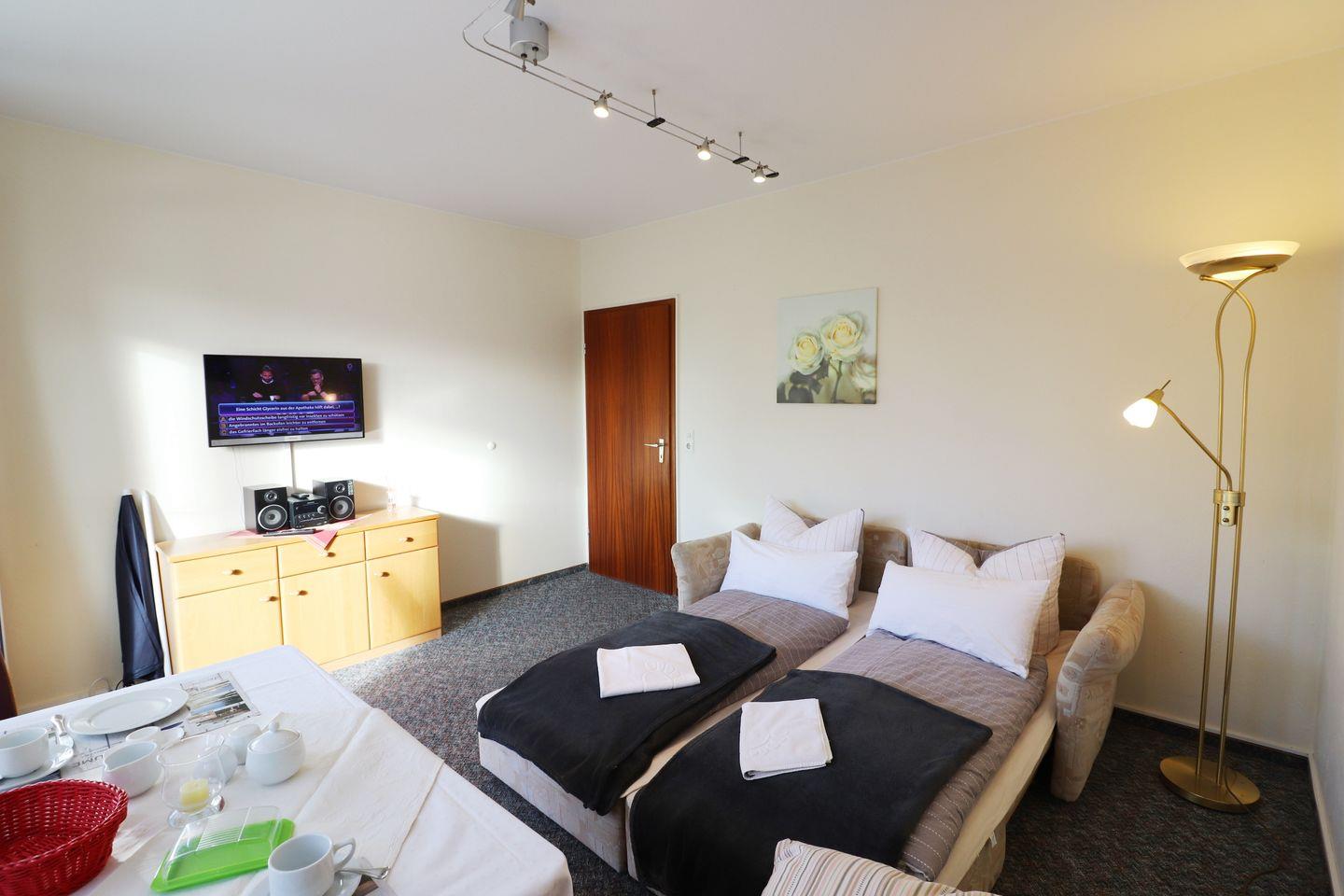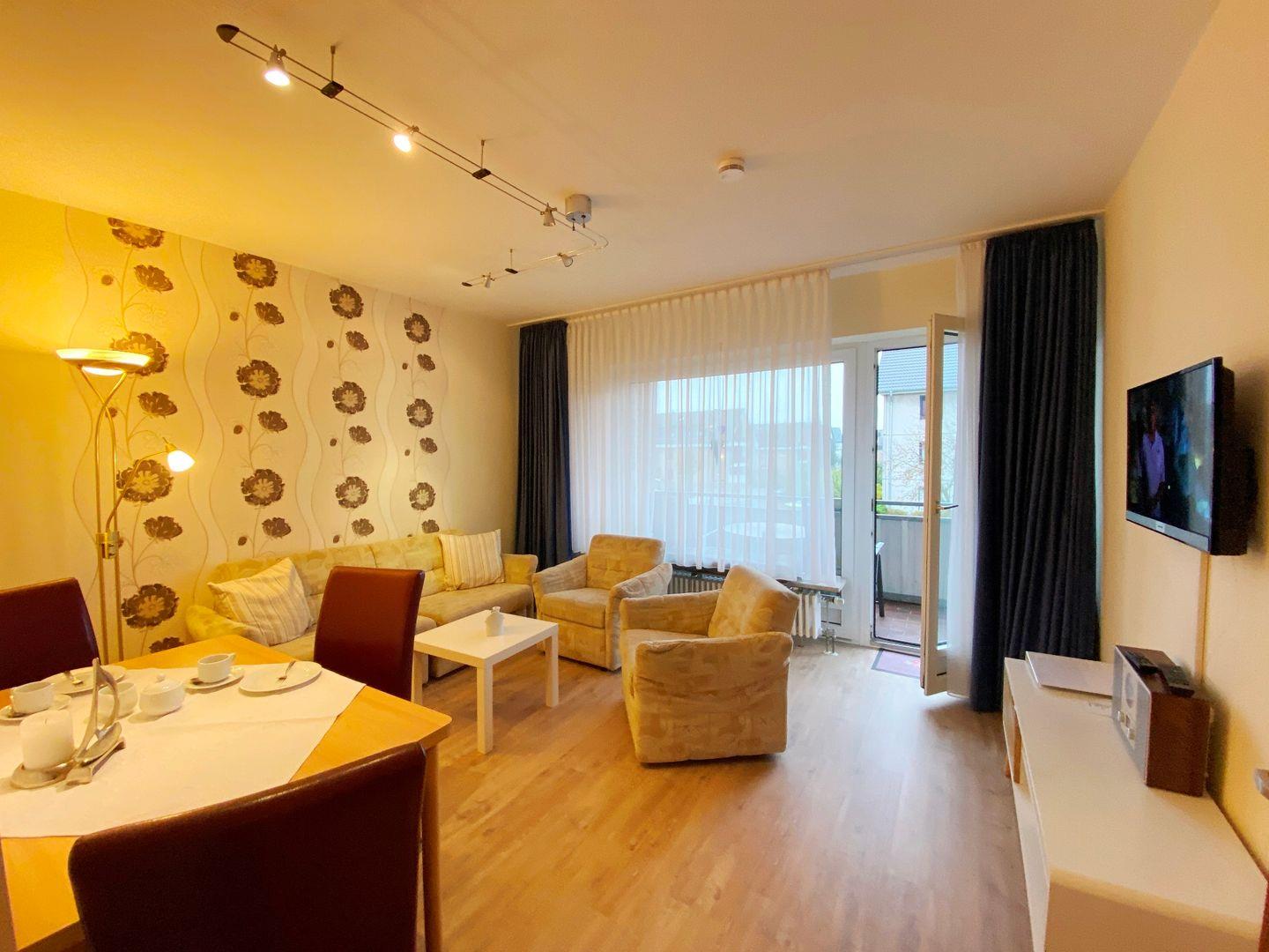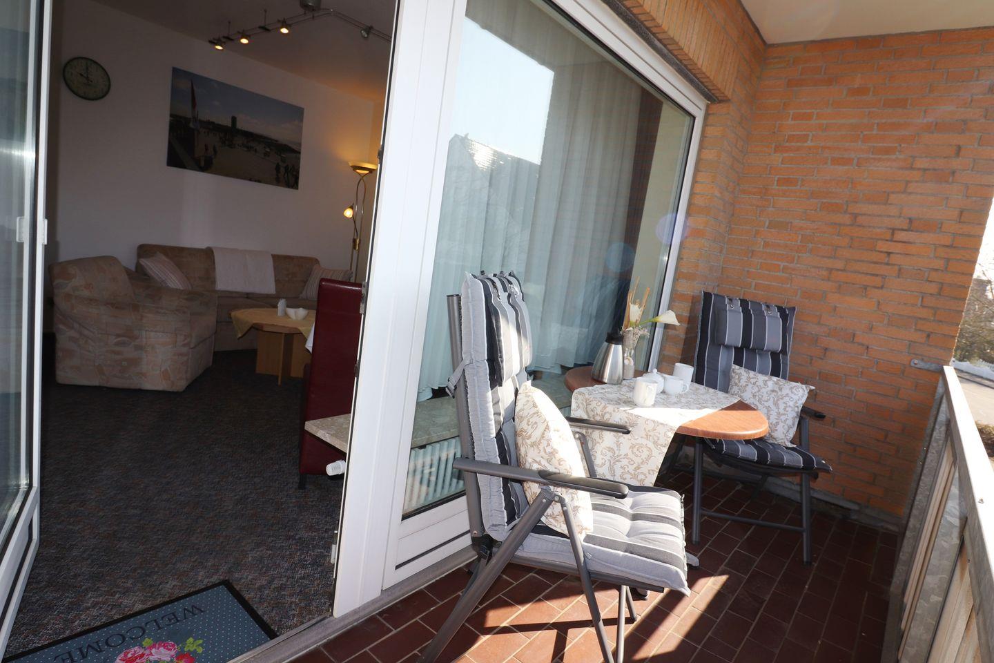 2-Raum-Wohnung für bis zu 4 Pers., 1 Schlafzimmer + 1 Schlafsofa (max. 2 Erwachsene und 2 Kinder), 1. Stock mit Balkon, Wlan, 1 Duschbad