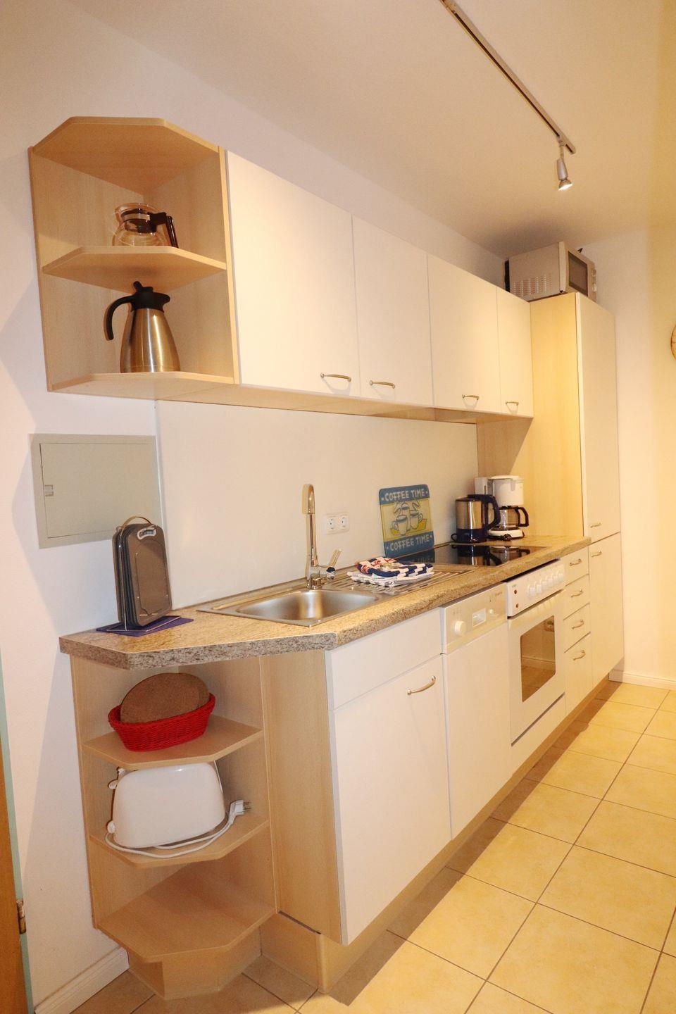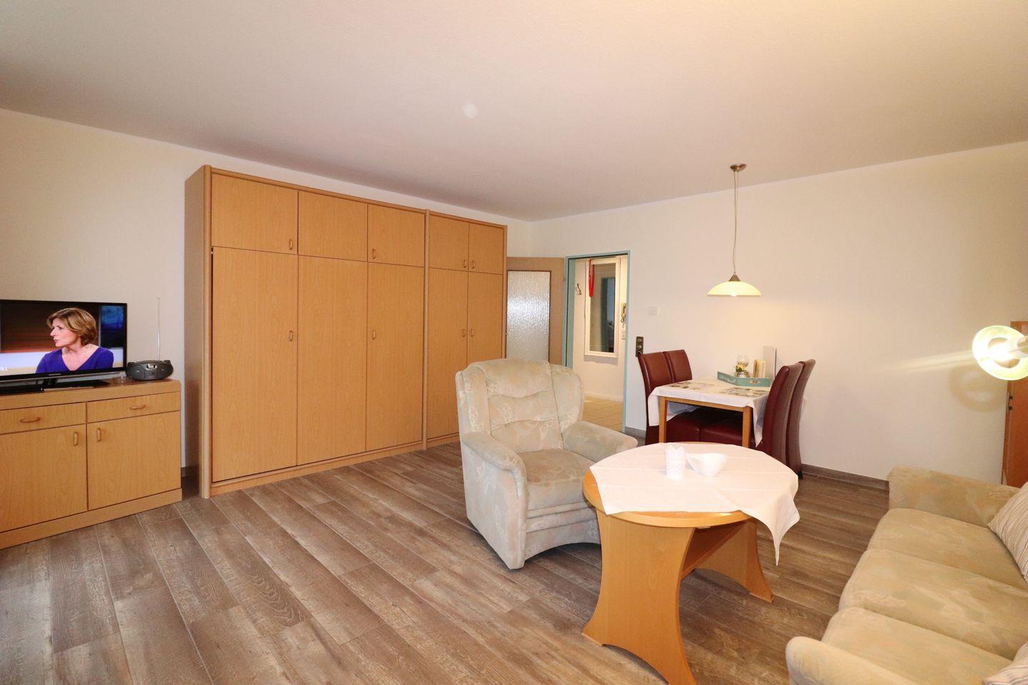 2-Raum-Wohnung für max. 4 Pers., Wlan, 1 Schlafzimmer, 1 Schrankbett, 1 Bad, 1 Küche, parterre mit Terasse, Haustiere nach Absprache gestattet