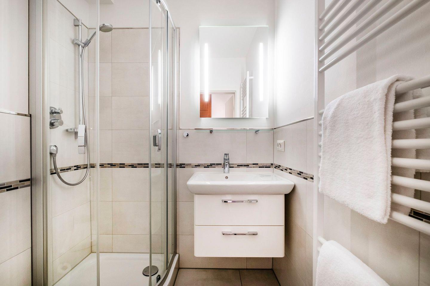 Das Bad verfügt über eine Dusche/WC. Vom Wohnbereich gelangen Sie auf den Balkon. Das eine Schlafzimmer verfügt über ein Doppelbett und das zweite Schlafzimmer über 2 Einzelbetten. Der Wohnung ist ein PKW - Stellplatz direkt am Haus zugehörig. Einen offenen Fahrradunterstand halten wir für Sie bereit.