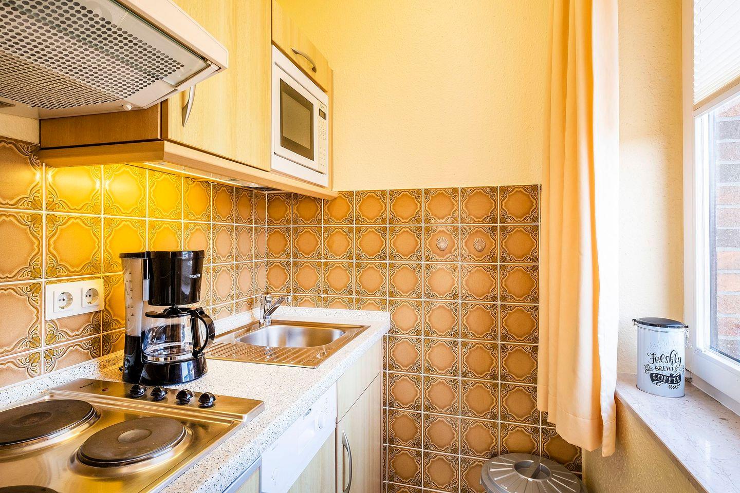 Küchenzeile: Geschirrspüler, Kochfeld, Mikrowelle, Kühlschrank mit Gefrierfunktion, Heißwasserkocher, Kaffeemaschine, Toaster.