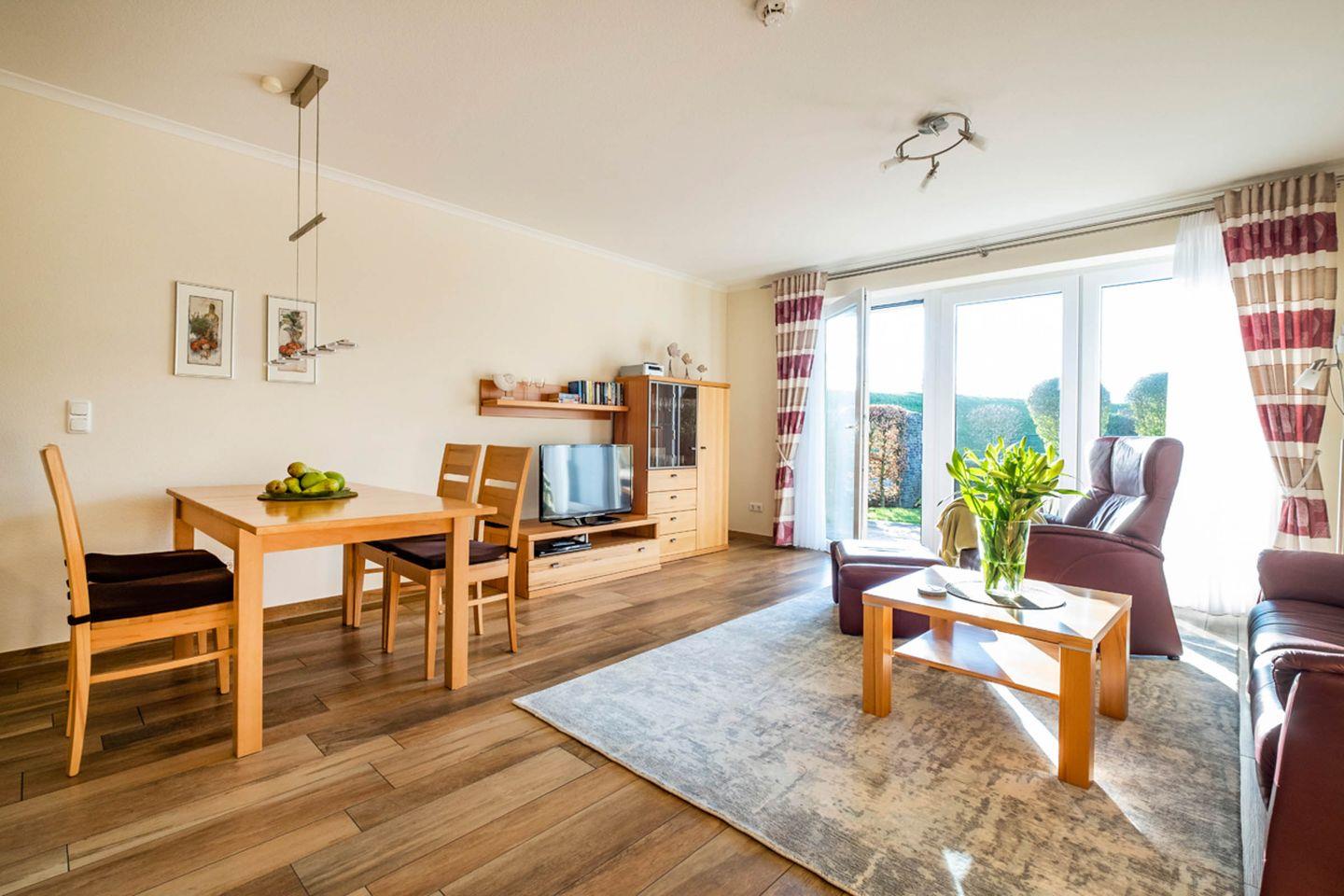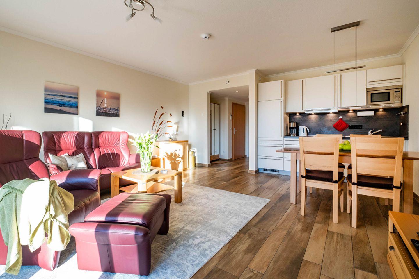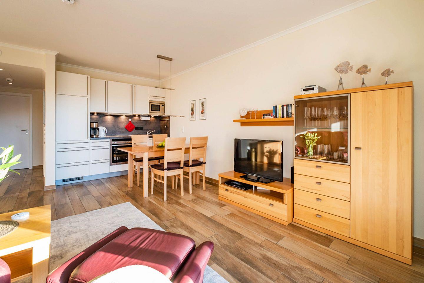 Die Ferienwohnung 0.4 (55qm) liegt im Erdgeschoss und ist eine helle, moderne 2-Raum-Wohnung mit Terrasse in Südwest-Lage. Die Küchenzeile und der Essbereich sind direkt im Wohnbereich integriert. Das Bad verfügt über eine Dusche.
