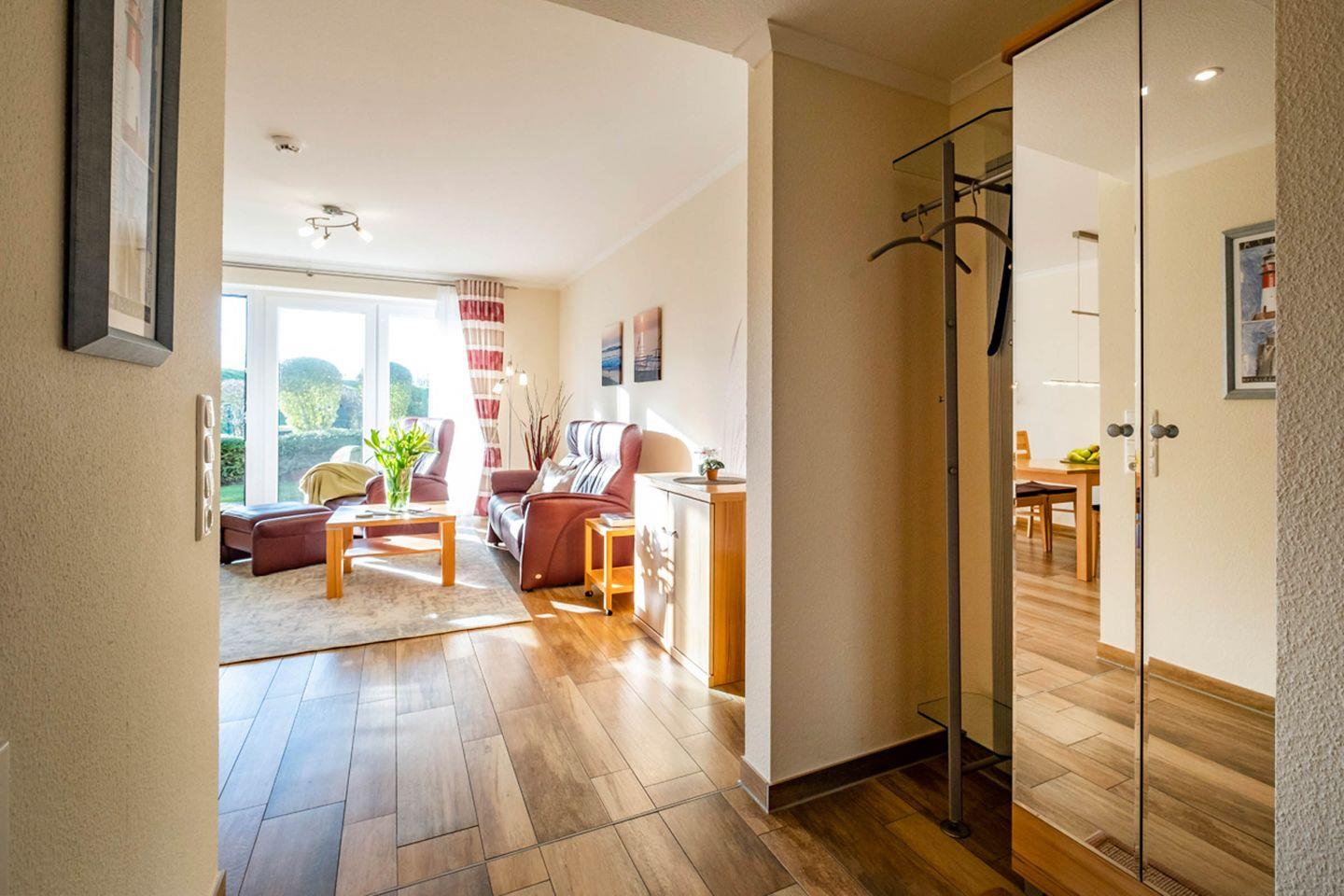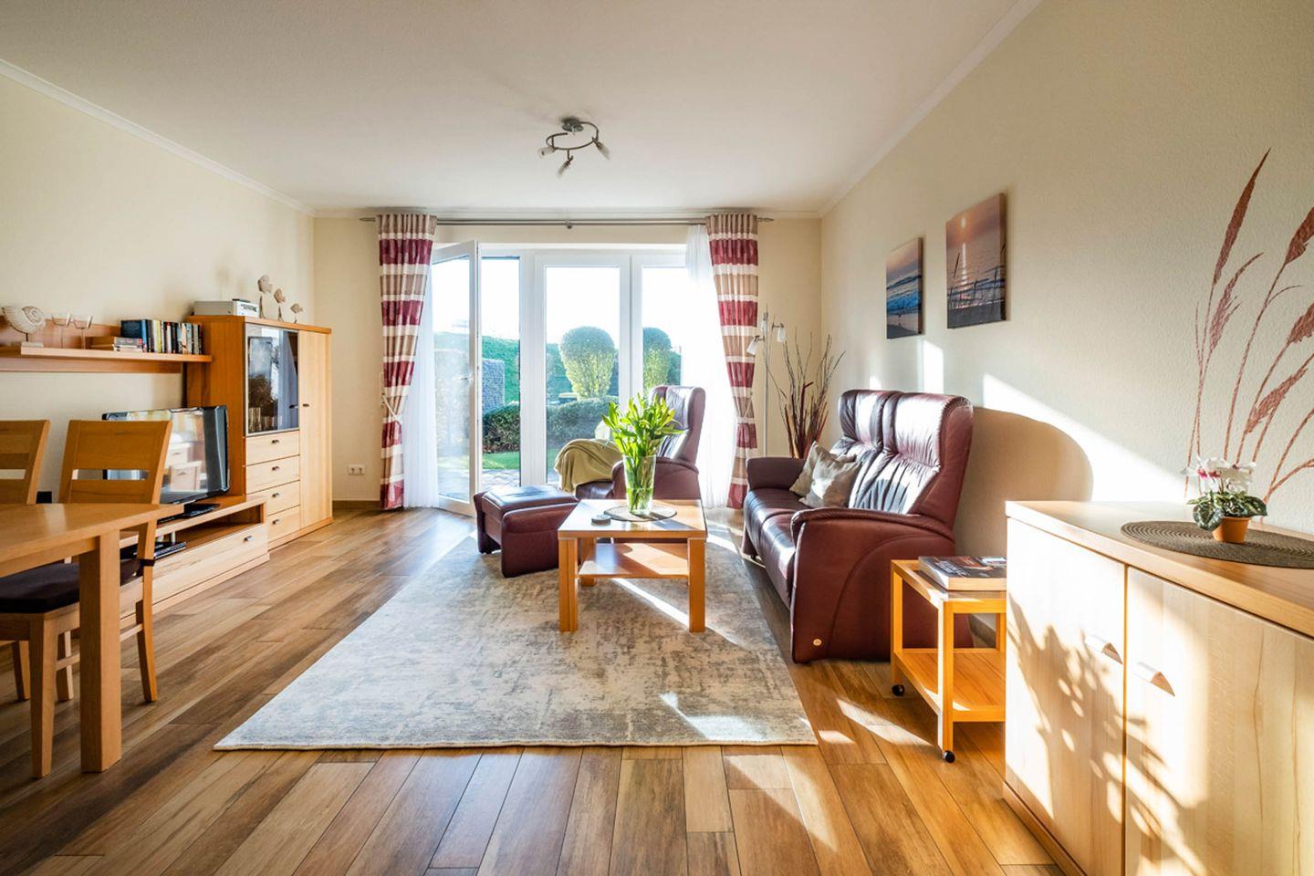 Haus Seehafen Apartment 0.4 in Büsum bietet auf 53 m² ein modernes Ambiente mit Terrasse, WLAN, Fußbodenheizung und offener Küche. Die Unterkunft liegt im Parterre, nur wenige Gehminuten vom Meer, Strand und Stadtzentrum entfernt. Ein Schlafzimmer mit TV, ein Wohnbereich mit TV, Küche mit Spülmaschine und Privatparkplatz sorgen für Komfort – ideal für zwei Personen.