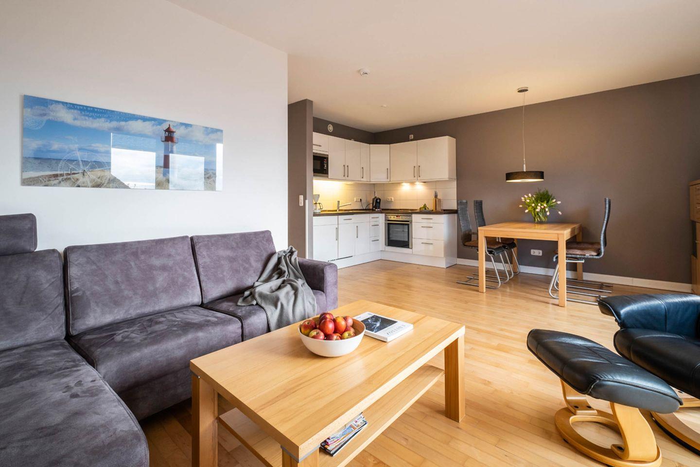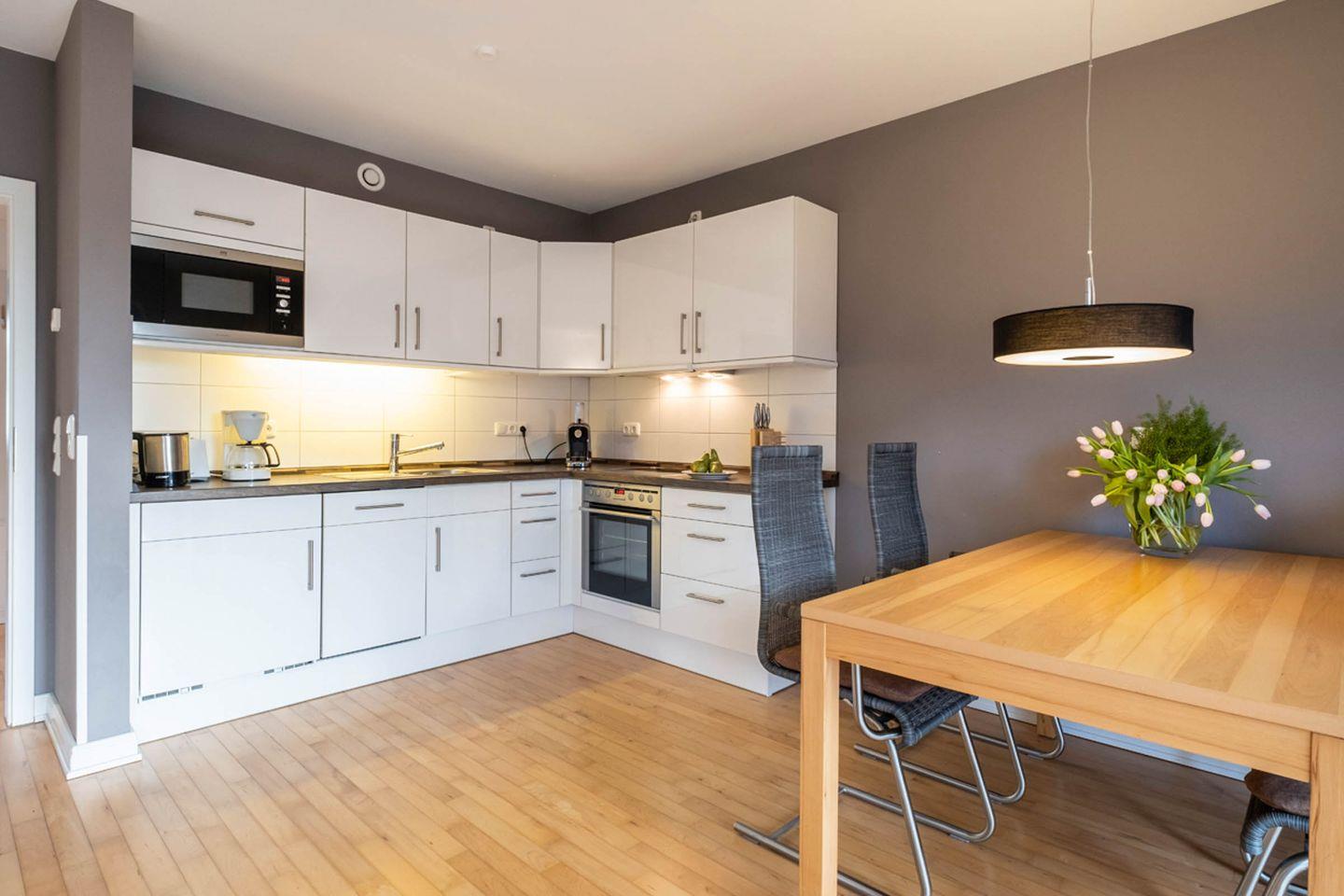 Die Ferienwohnung 2.1 (71qm) liegt im 2. Obergeschoss und ist eine helle, moderne 3-Raum-Wohnung mit Balkon in Südwest-Lage. Die Küchenzeile und der Essbereich sind direkt im Wohnbereich integriert. Das Bad verfügt über eine ebenerdige Dusche, WC.
