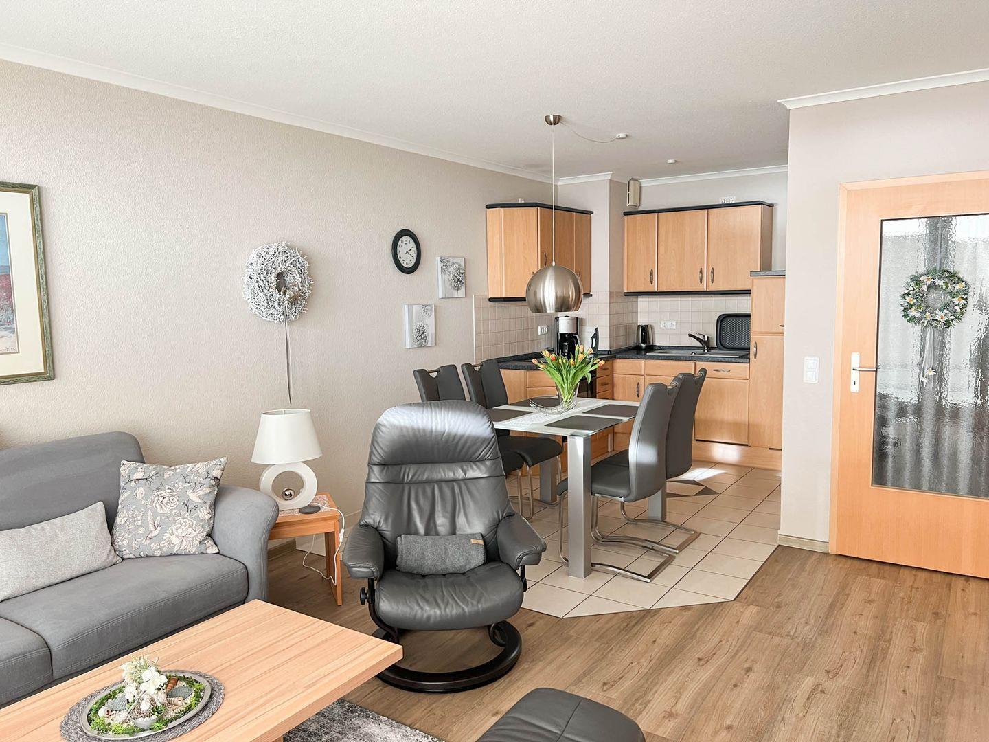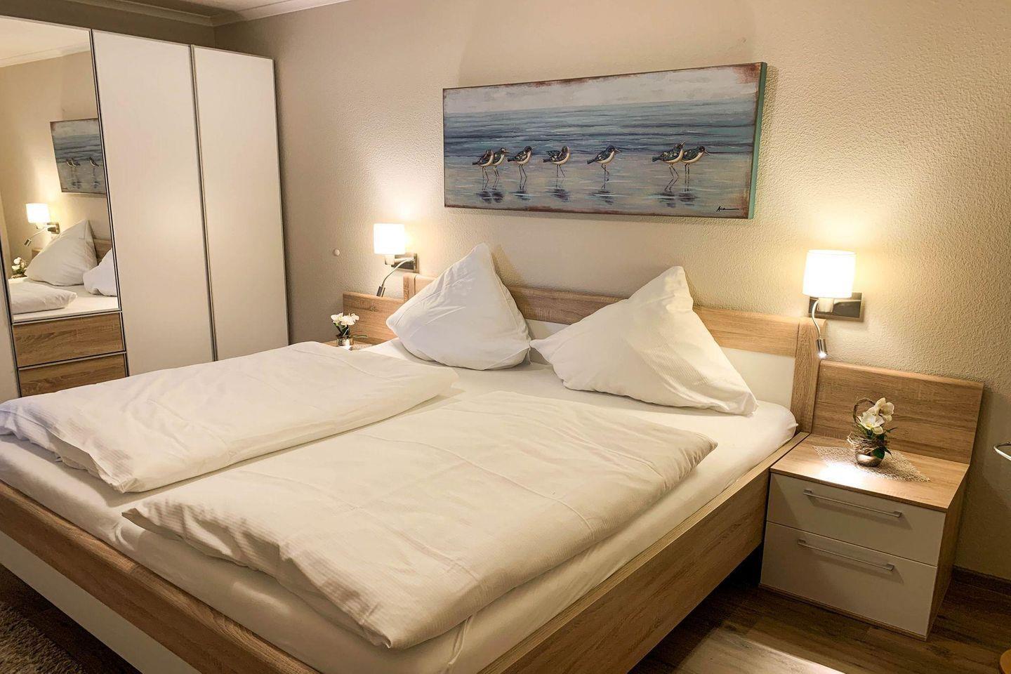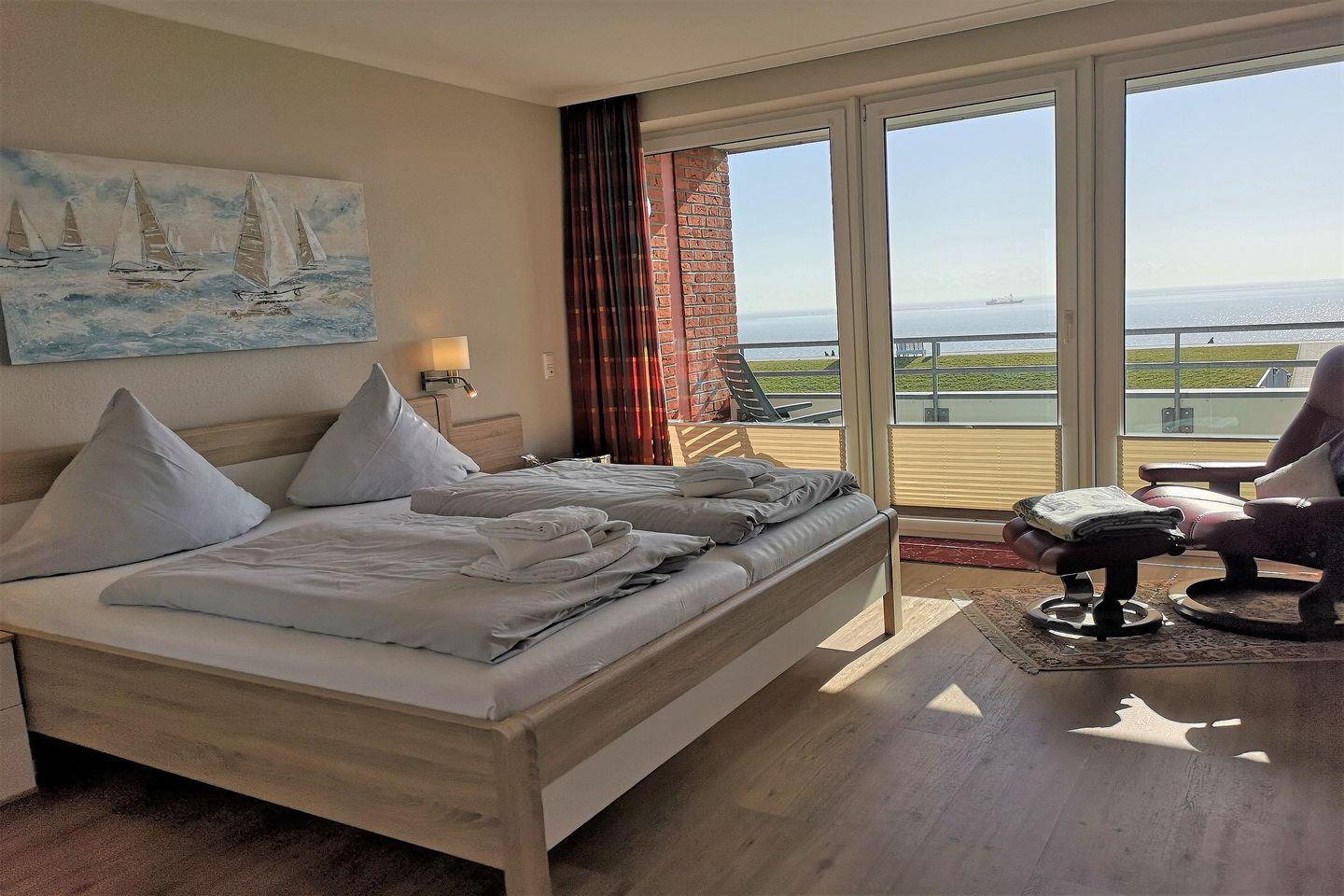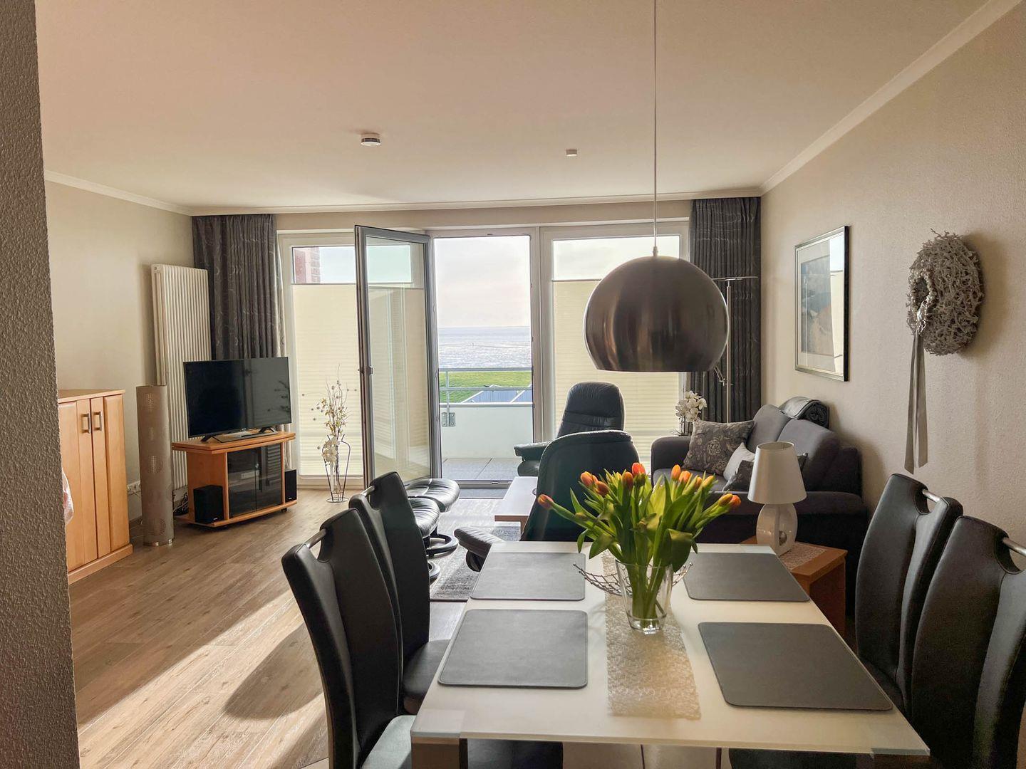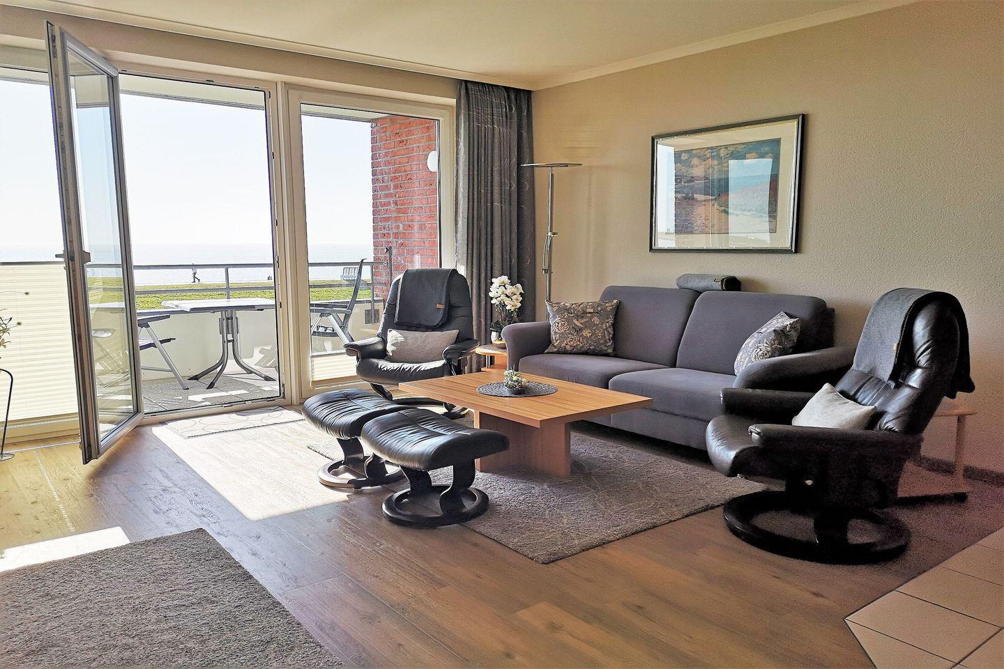 Sie werden kaum ein besseres Ferienappartement in Büsum finden! Diese Wohnung mit direktem Meerblick besteht aus Wohnzimmer, Küchenzeile mit Essbereich, 2 Schlafzimmern, davon eins mit TV, einem Badezimmer und einem Gäste-WC. Das Bad verfügt über eine Dusche. Vom Wohnzimmer sowie von einem der Schlafzimmer gelangen Sie direkt auf den großzügigen Balkon. Die Schlafzimmer verfügen über je ein Doppelbett. Der Wohnung ist ein PKW-Stellplatz direkt am Haus zugehörig.