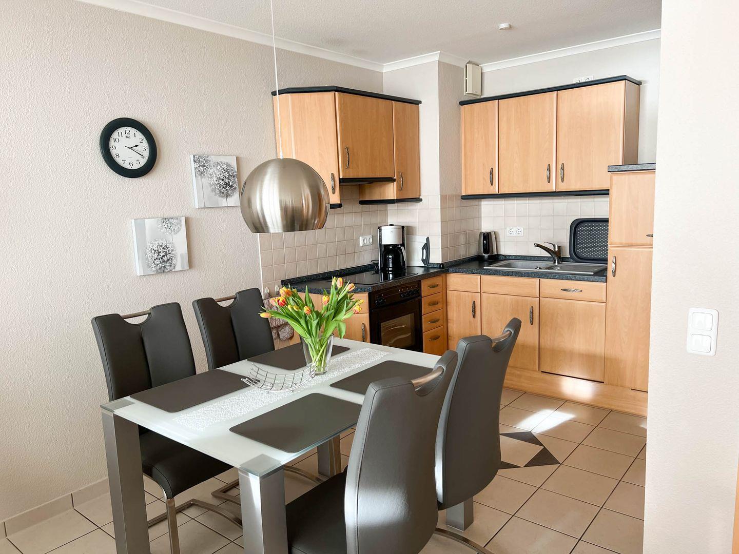 Küchenzeile: Geschirrspüler, Backofen, Kochfeld, Mikrowelle, Kühlschrank mit Gefrierfunktion, Heißwasserkocher, Kaffeemaschine, Toaster.