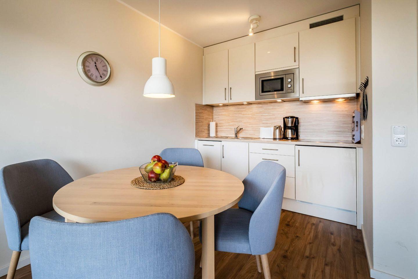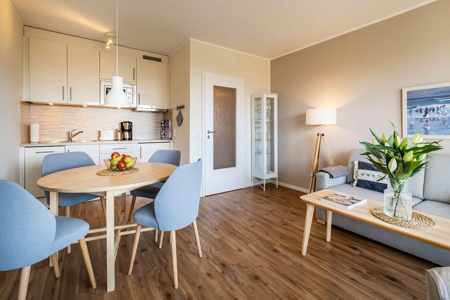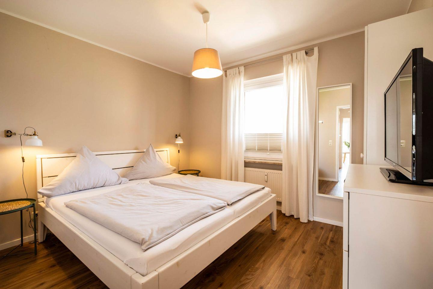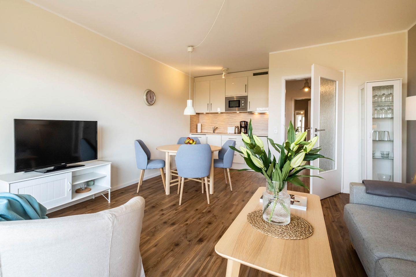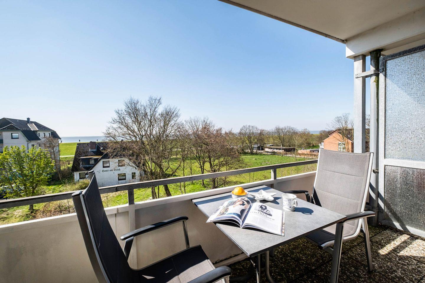 Die Ferienwohnung Nr. 32 mit Meerblick im Haus Nordseeblick befindet sich im III. Obergeschoss und verfügt über einen Balkon. Die Wohnung wurde Anfang 2017 komplett renoviert. Im Wohnzimmer finden Sie eine gemütliche Couchgarnitur vor. Die Küche und der Essbereich sind im Wohnbereich integriert. Das Schlafzimmer ist mit einem Doppelbett und TV ausgestattet. Das Bad verfügt über eine Dusche/WC. Vom Wohnzimmer aus gelangt man auf den in Südwestlage liegenden Balkon. Im Keller befinden sich eine Waschmaschine und ein Trockner (gebührenpflichtig) sowie ein Abstellraum für Fahrräder. Fährräder können auch vor dem Haus im Fahrradständer abgestellt werden. Das Haus verfügt über einen Aufzug.